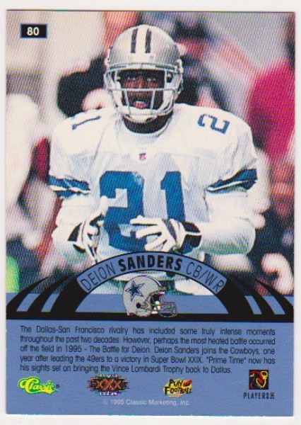 This is a 1996 Classic NFL Experience Printer's Proof Deion Sanders #80 insert card. These say "1995 Classic Marketing" on the back, but this is actually a 1996 Classic NFL Experience Super Bowl XXX Insert Card. It is in approximately EX-MT to Near Mint condition. It has very minor wear, but overall displays pretty well. This Deion insert was a tough card to pull from packs as only 499 were produced.