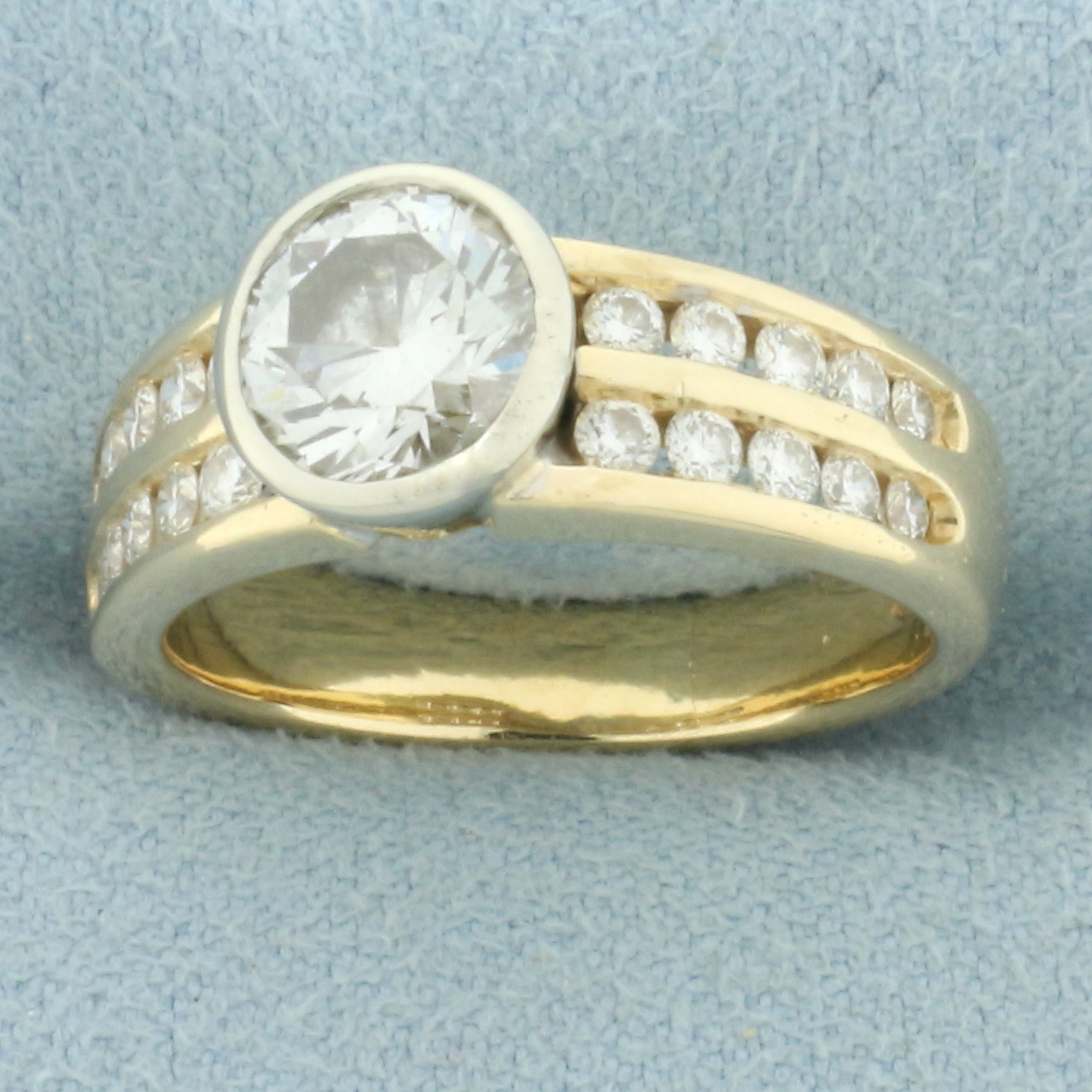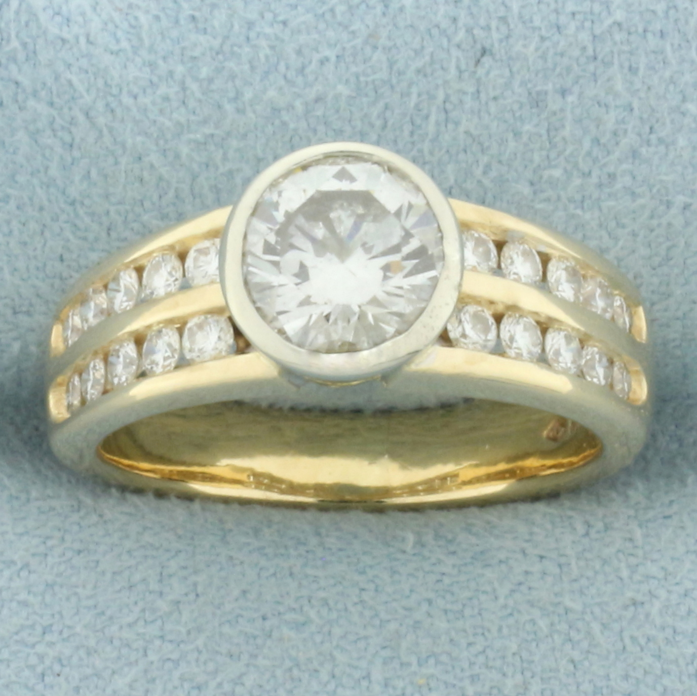In 14k yellow gold. Center diamond is high quality 1 2/3ct round brilliant cut, SI clarity/H color, completely eye clean and great cut for lots of sparkle. Accented by 2 rows of 20 channel set diamonds, .60ctw, VS clarity/H color. Size: 7. 7.6g.