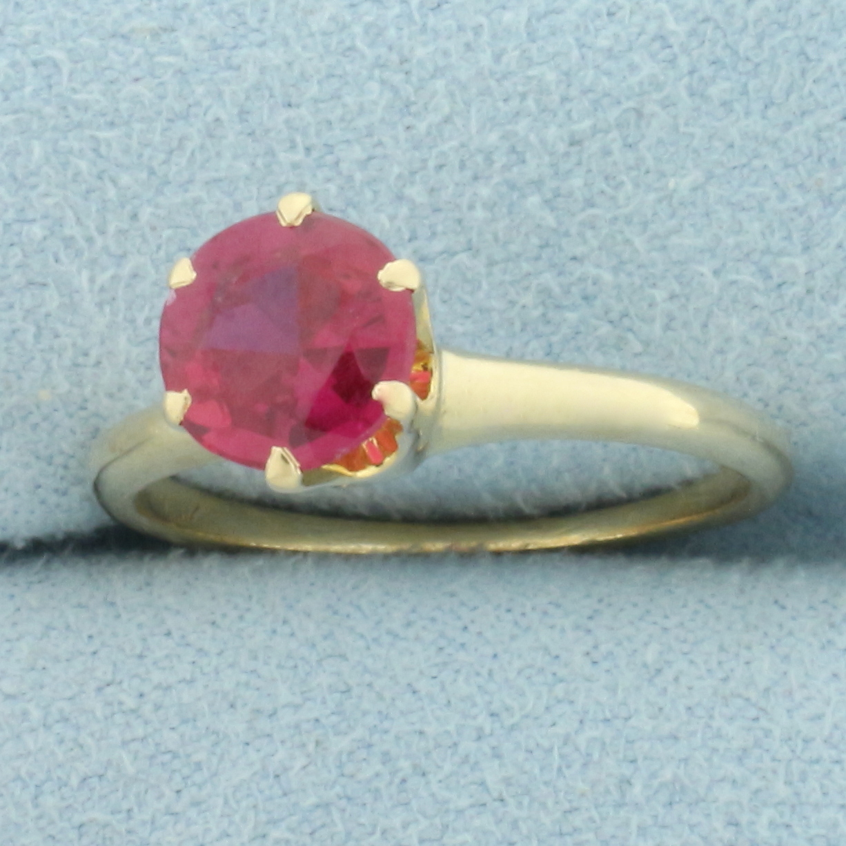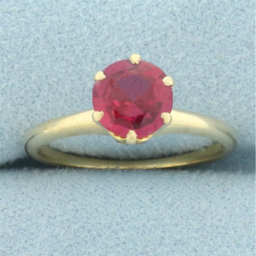 In 14k yellow gold. Contains one high quality 7.3mm Pink Sapphire gemstone, approximately 1.5ct, with vibrant color and excellent clarity. Size: 7.5. 3.0g.