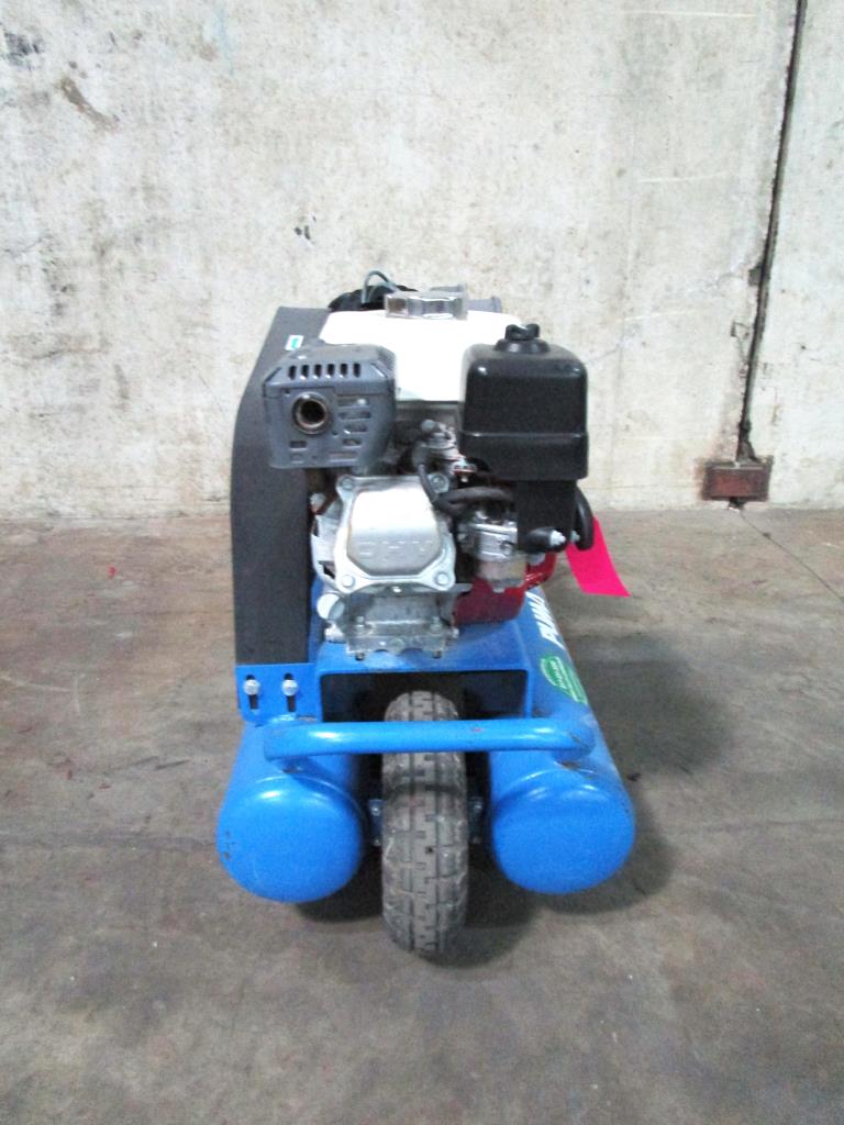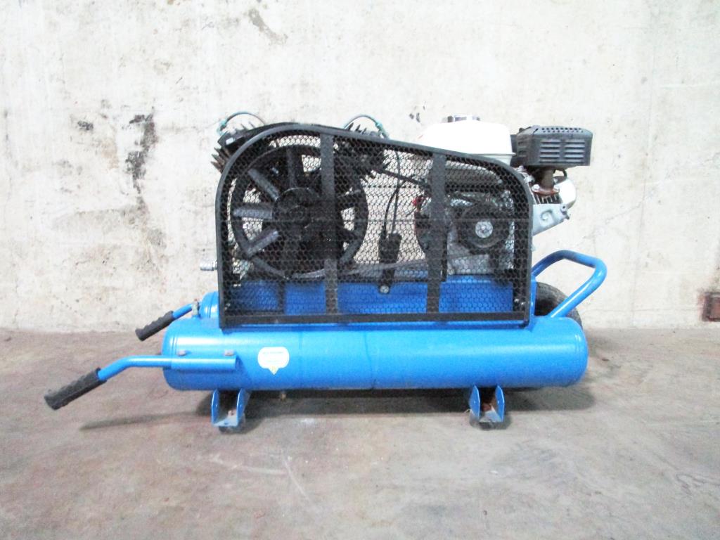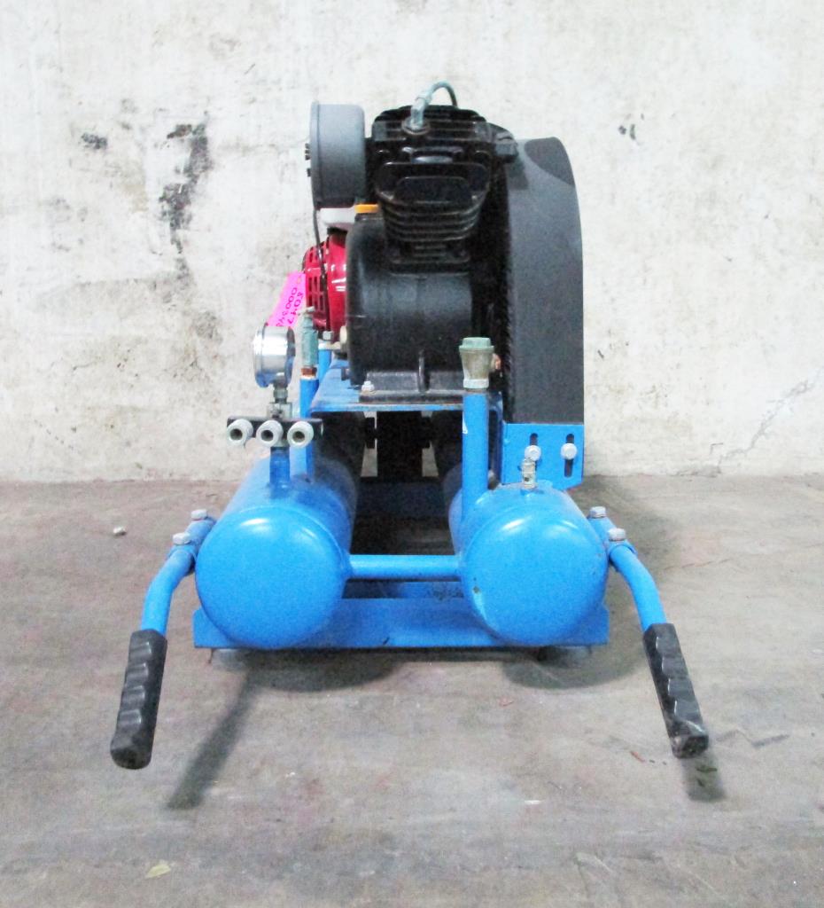- Honda engine GX 160 series, 5.5HP, 150PSI Max, 130PSI work, 8 gallon tank, 3 air connects, dual handles, single wheels.
