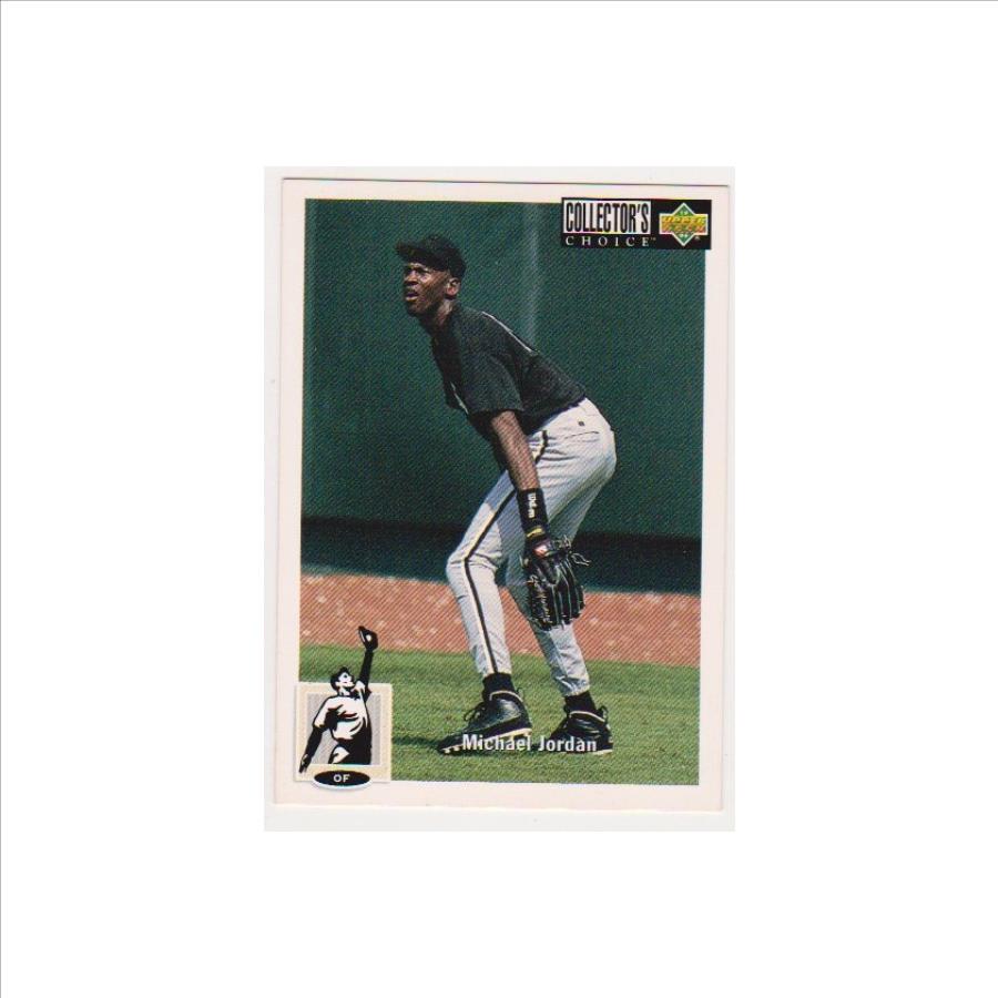 This is a 1994-95 Upper Deck Collector's Choice Michael Jordan #23 card.  This is the tough to find German version.  It is one of few cards that has Jordan playing baseball on them but the more scarce part is being the bilingual version released in Germany.  The difference is on the back of the card where at the bottom it has a paragraph in English and German.  This is an approximately EX condition card. It has light corner wear, but overall this is a decent looking card of this NBA Hall of Famer.