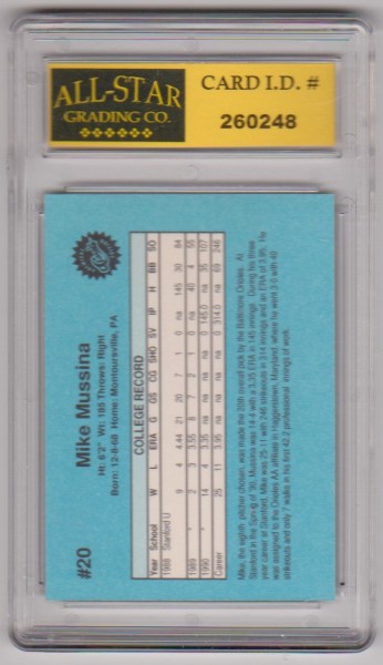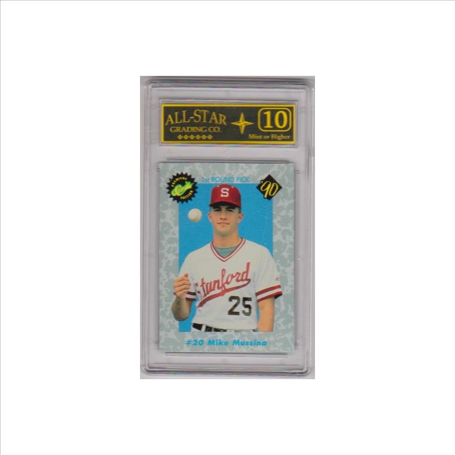 This is a Mike Mussina 1990 Classic #20 card that has been graded a Mint or Higher 10 by ASG.  There is some light surface wear on the back of the holder, but overall this is a nice graded rookie card of this baseball Hall of Famer.