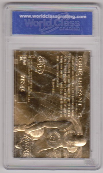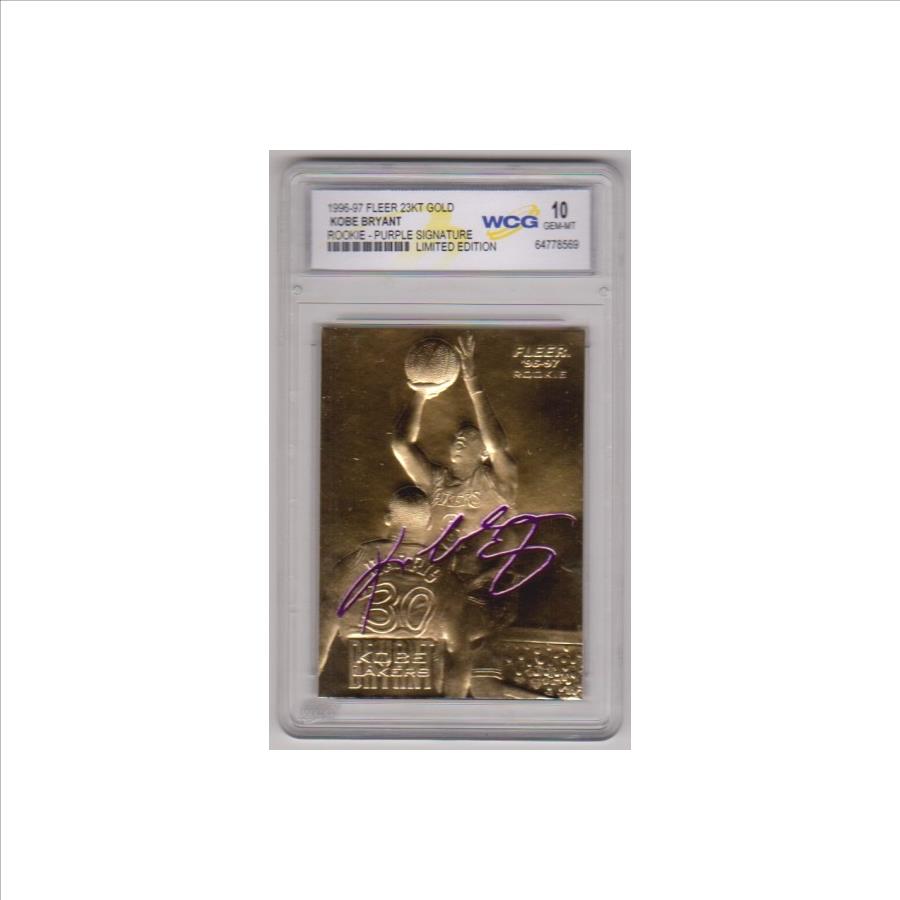 This is a 1996-97 Fleer w/ Purple Signature (Printed Facsimile, not hand signed) 23 Kt Gold Kobe Bryant rookie card that has been graded a Gem Mint 10 by WCG. The holder has some surface wear, but overall this is a sharp graded rookie card of this NBA Hall Of Famer.