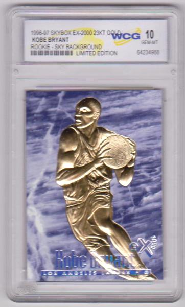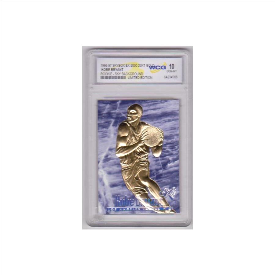 This is a 1996-97 Skybox EX-2000 Sky Background 23 Kt Gold Kobe Bryant rookie card that has been graded a Gem Mint 10 by WCG.  This is a sharp graded rookie card of this legendary basketball player.