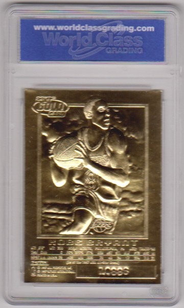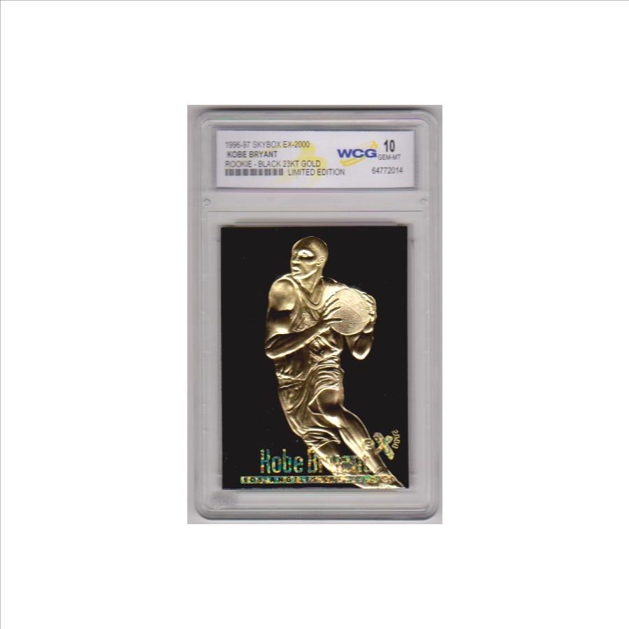 This is a 1996-97 Skybox EX-2000 Black 23 Kt Gold Kobe Bryant rookie card that has been graded a Gem Mint 10 by WCG. The holder has some light surface wear, but overall this is a sharp graded rookie card of this NBA Hall Of Famer.
