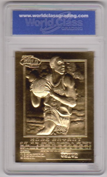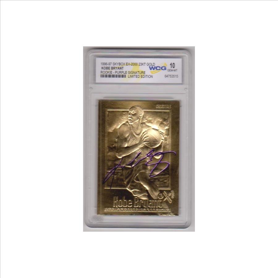This is a 1996-97 Skybox EX-2000 w/ Purple Signature (Printed Facsimile, not hand signed) 23 Kt Gold Kobe Bryant rookie card that has been graded a Gem Mint 10 by WCG.  The holder has some light surface wear, but overall this is a sharp graded rookie card of this NBA Hall of Famer.