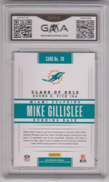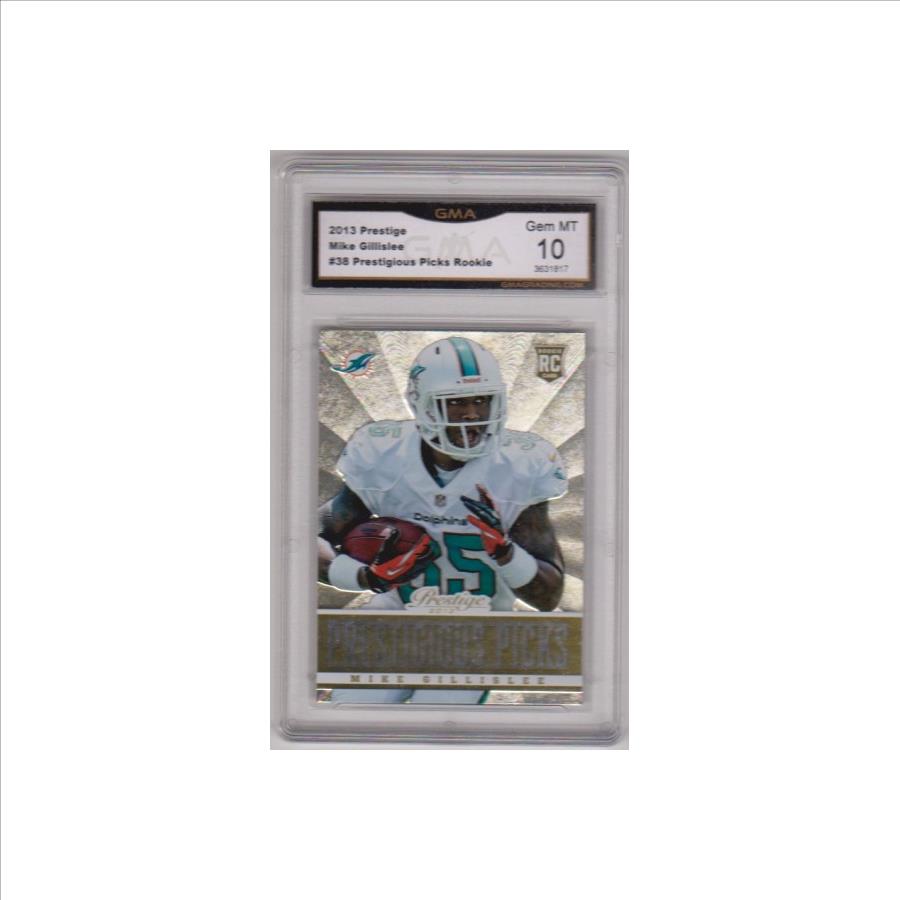 This is a Mike Gillislee 2013 Panini Prestige Prestigious Picks #38 rookie card that has been graded a Gem Mint 10 by GMA. The holder has some light surface wear, but overall this is a nice graded Gillislee rookie card.