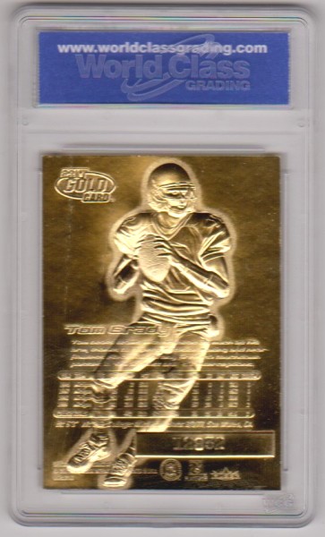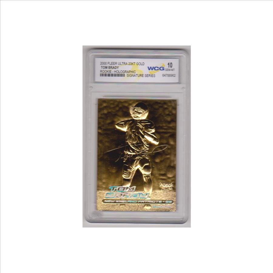 This is a 2000 Fleer Ultra Tom Brady 23 Kt Gold Holographic Signature Series Rookie Card that has been graded a Gem Mint 10 by WCG. The holder has some light surface wear, but overall this is a sharp graded rookie card of this retired NFL star.