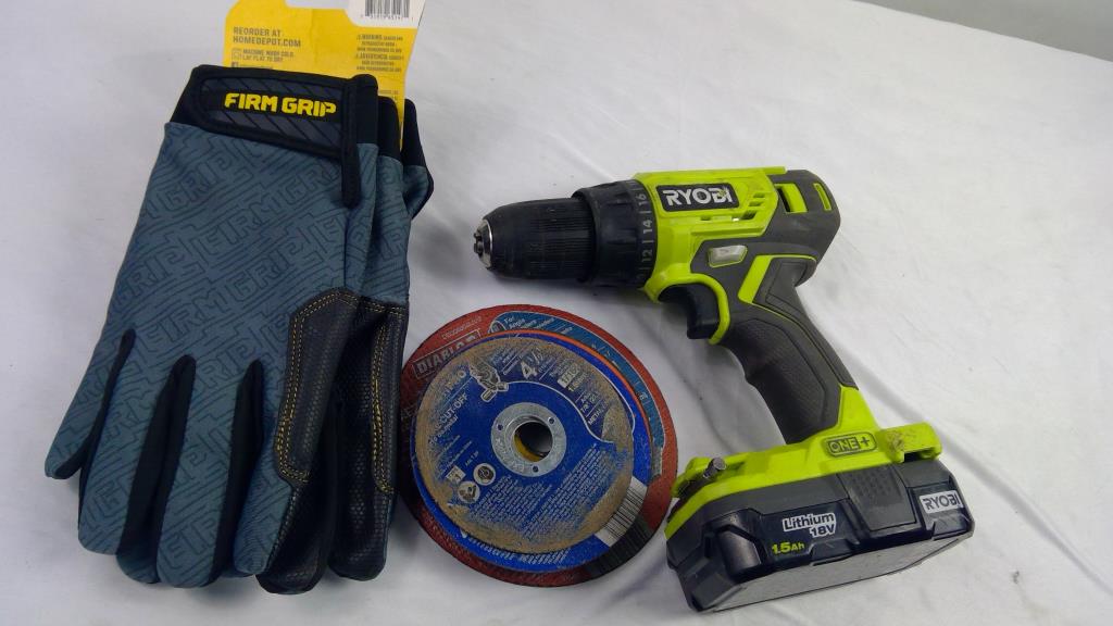 Ryobi One+ Drill Driver, Dewalt, Diablo Grinding Wheels, And Working Gloves, 10 Pieces