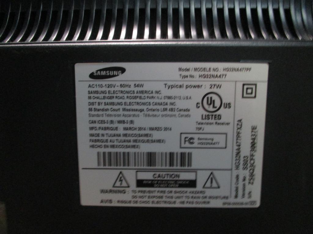 Get a great deal with this online auction presented by PropertyRoom.com on behalf of a law enforcement or public agency client. Model: HG32NA477PF Screen Size: 32" Date of Manufacture: March 2014 Measurements: height 17", width 29", length 5" Base: no Remote Control: no Power Cord: no Physical Condition: good condition, stand damaged, dirty, scratches, nicks Testing Results: Item was tested for power only and it powered on, displayed menu. Input and output ports were not tested and may be non-functional. Item is sold "As Is".