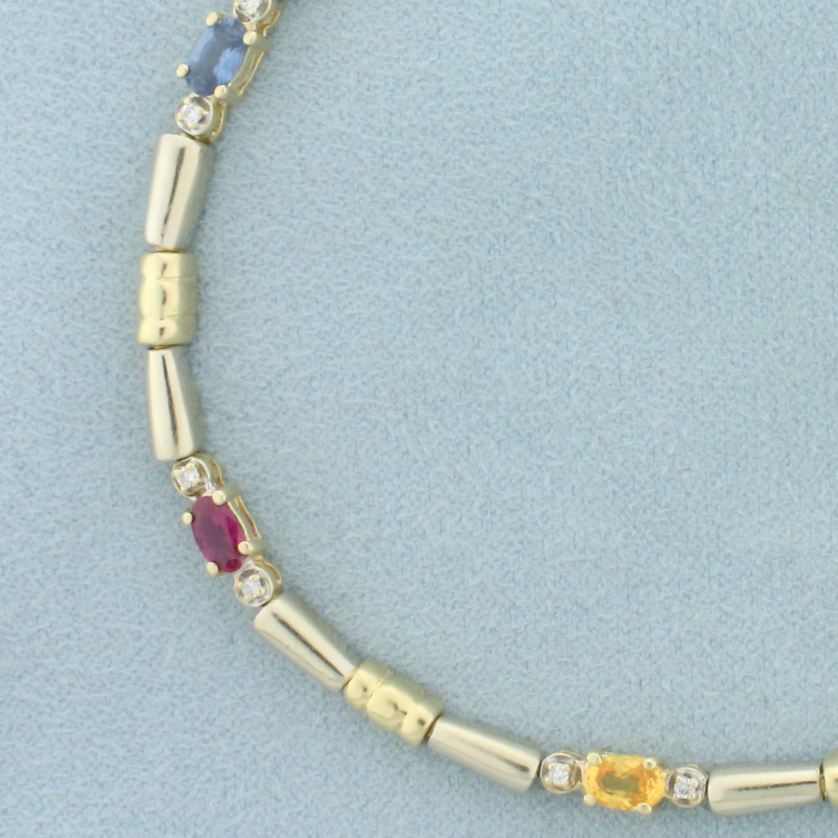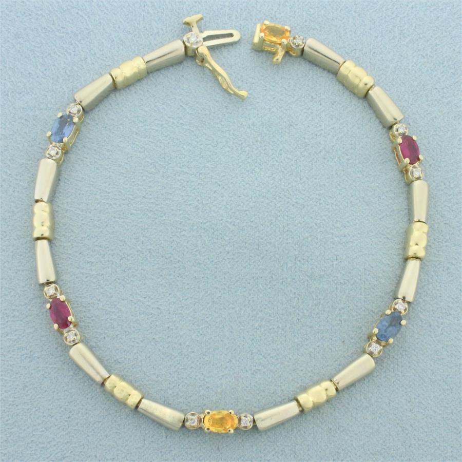 In 14k white and yellow gold. Contains two pink, two yellow, and two blue high quality natural 5mm by 3mm Sapphire gemstones with vibrant color and excellent clarity .Also contains twelve high quality 1/2pt diamonds. Concealed slide closure with safety latch. 7 1/4 inches long and 3.7mm wide. 12.1g.