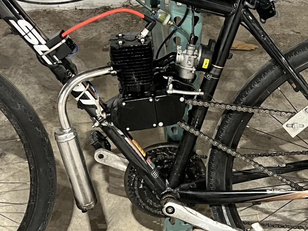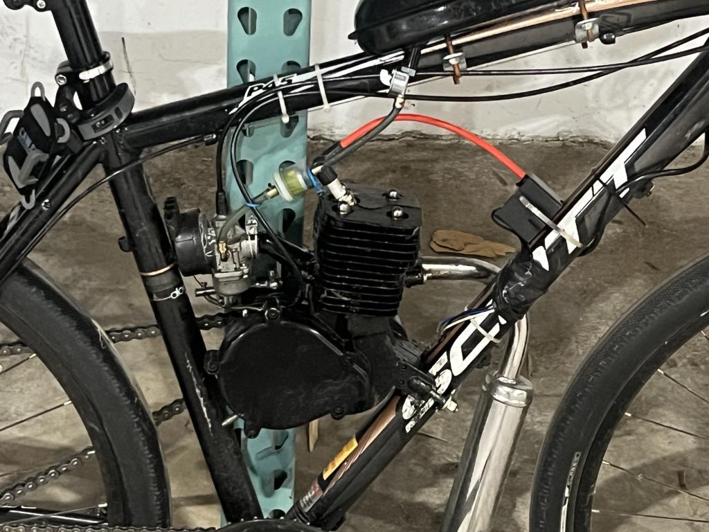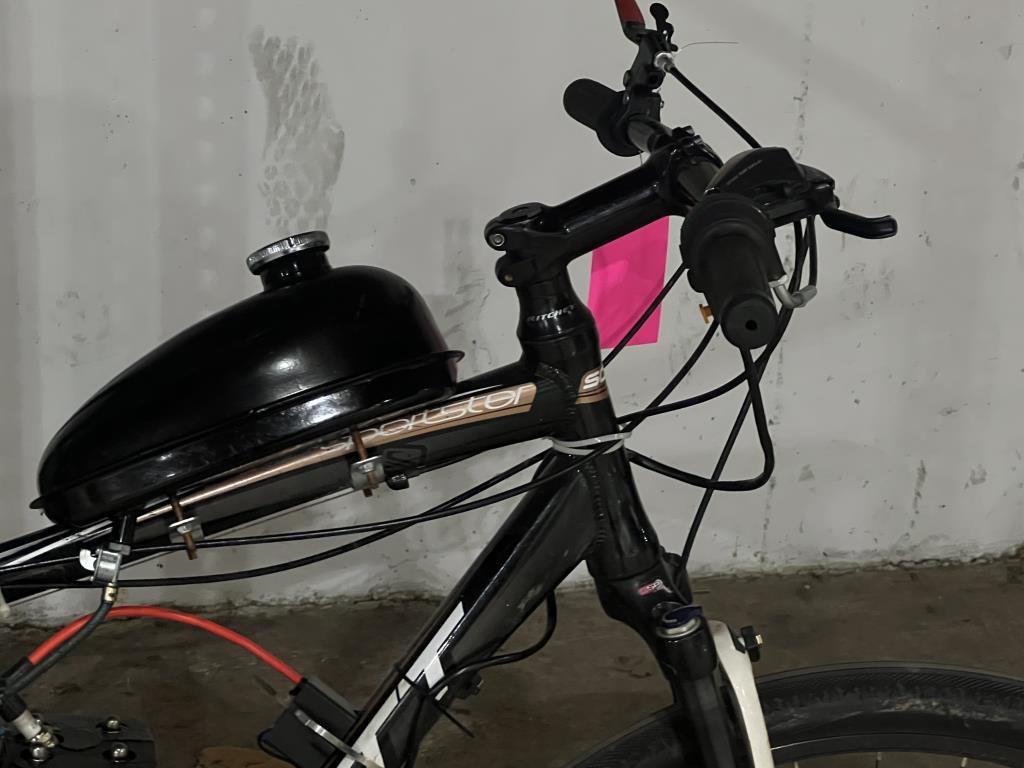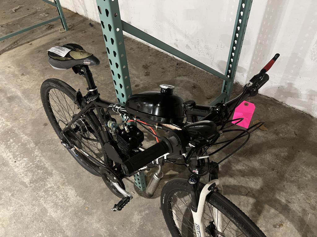 - Item info: gas powered, pull cord start, right grip throttle, dual hand brakes, single speed motor, 1 gallon gas tank, disc brakes, 21 speed bike.