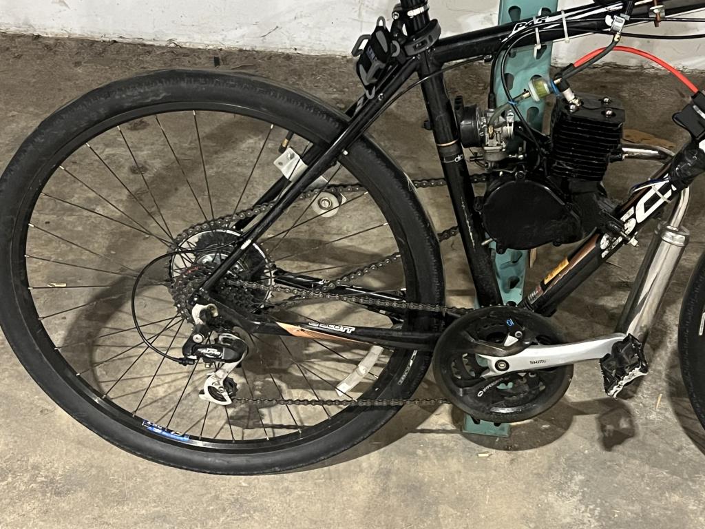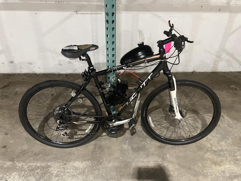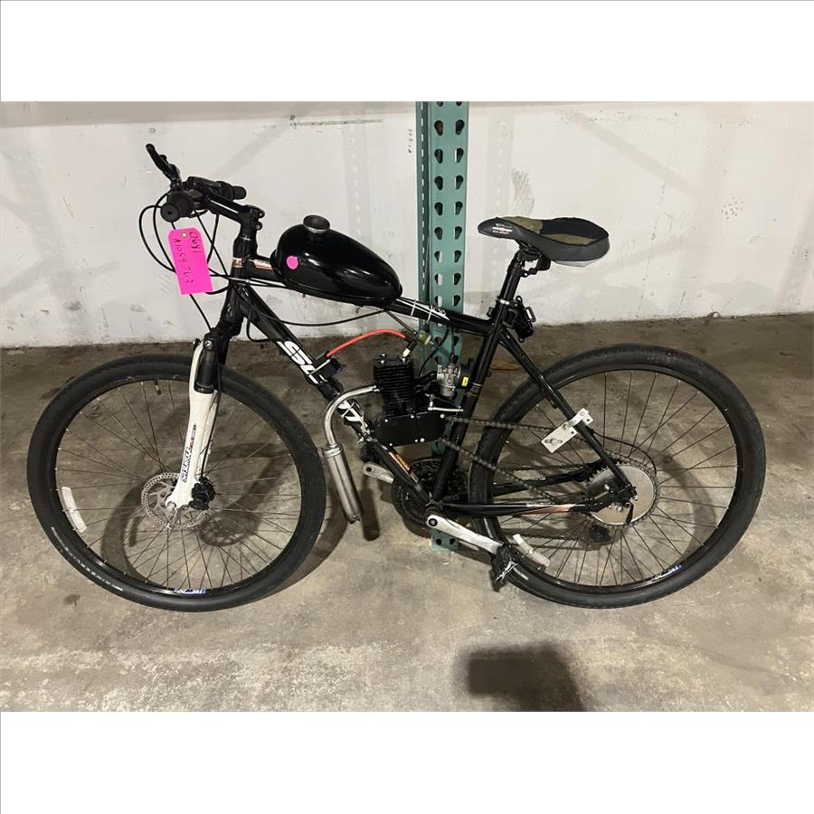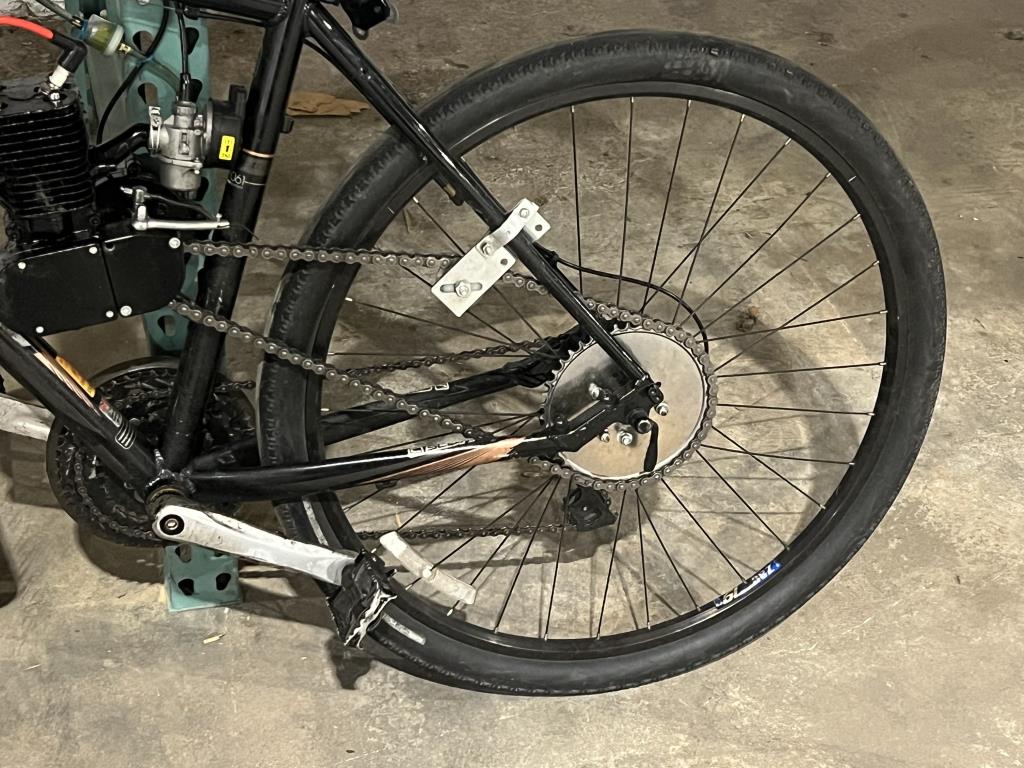 - Item info: gas powered, pull cord start, right grip throttle, dual hand brakes, single speed motor, 1 gallon gas tank, disc brakes, 21 speed bike.