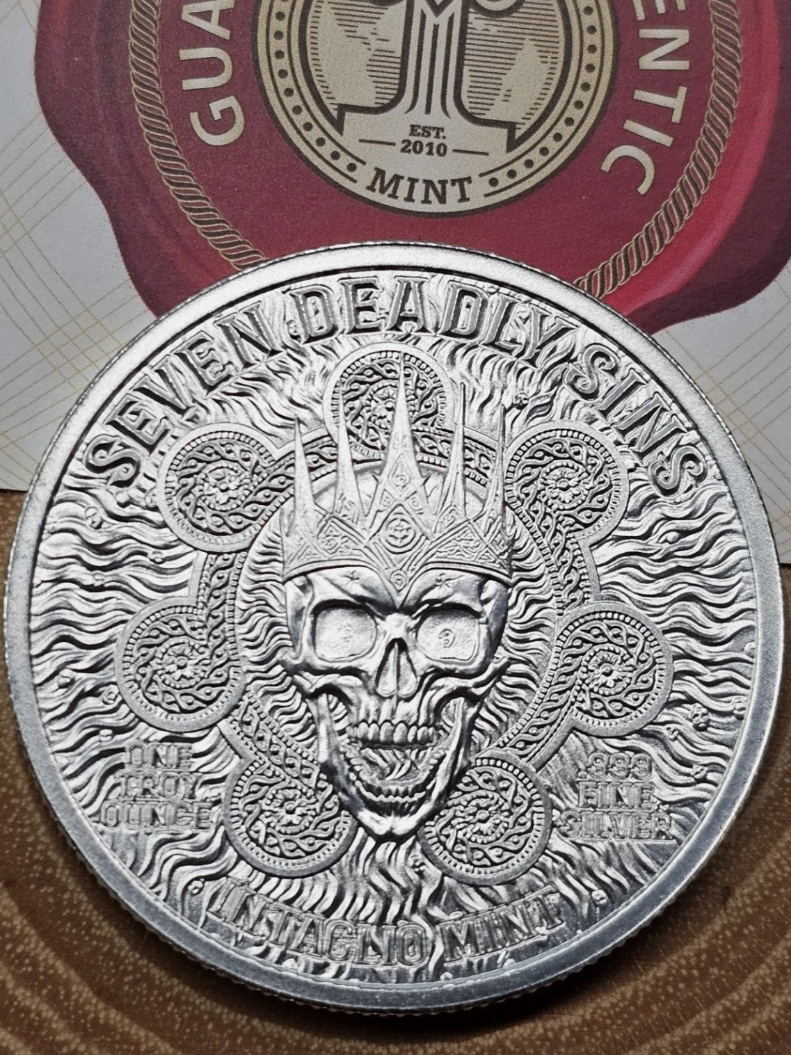 The reverse bears the series’ signature crowned skull motif, flanked by the seven sigils of sin. Radiating lines and fiery patterns frame the skull, serving as a stark reminder that anger, once unleashed, consumes all in its path.