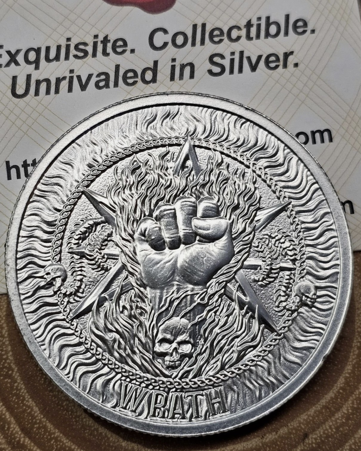 • “Wrath” obverse – a clenched fist engulfed in flame and fury