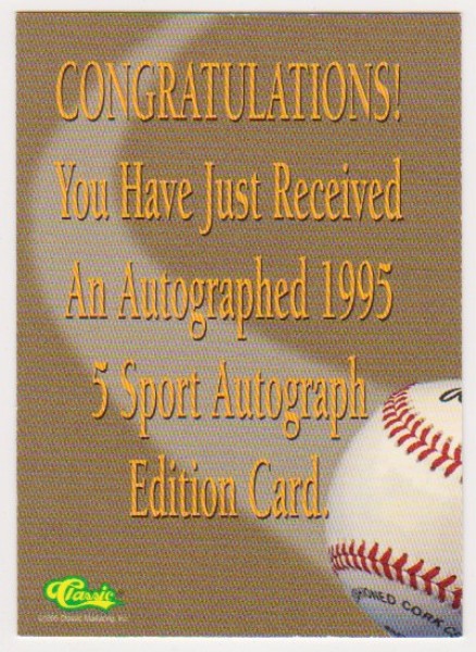 This is a Mark Redman 1995 Classic 5-Sport Certified Autographed Insert rookie card.  It is in approximately Near Mint condition.  This is a nice looking autographed Redman rookie card that was tough to pull from packs.