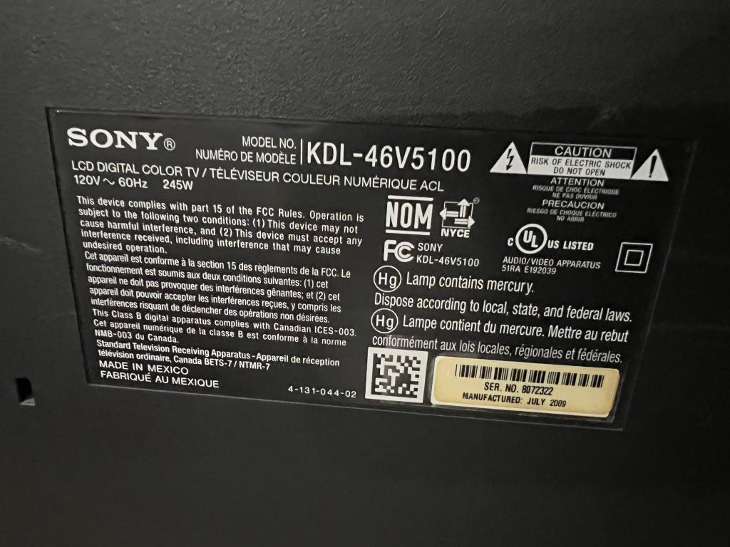 Get a great deal with this online auction presented by PropertyRoom.com on behalf of a law enforcement or public agency client. Model: KDL-46V5100 Screen Size: 46" Date of Manufacture: 2009 Measurements: height 31", length 44" Base: yes Remote Control: no Power Cord: yes Physical Condition: no damages Testing Results: Item was tested for power only and it powered on, displayed menu. Input and output ports were not tested and may be non-functional. Item is sold "As Is".