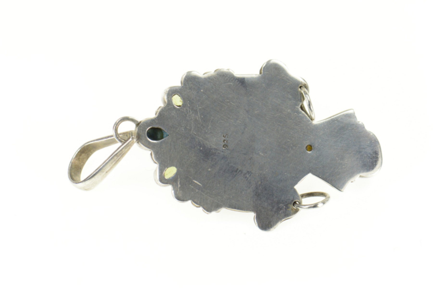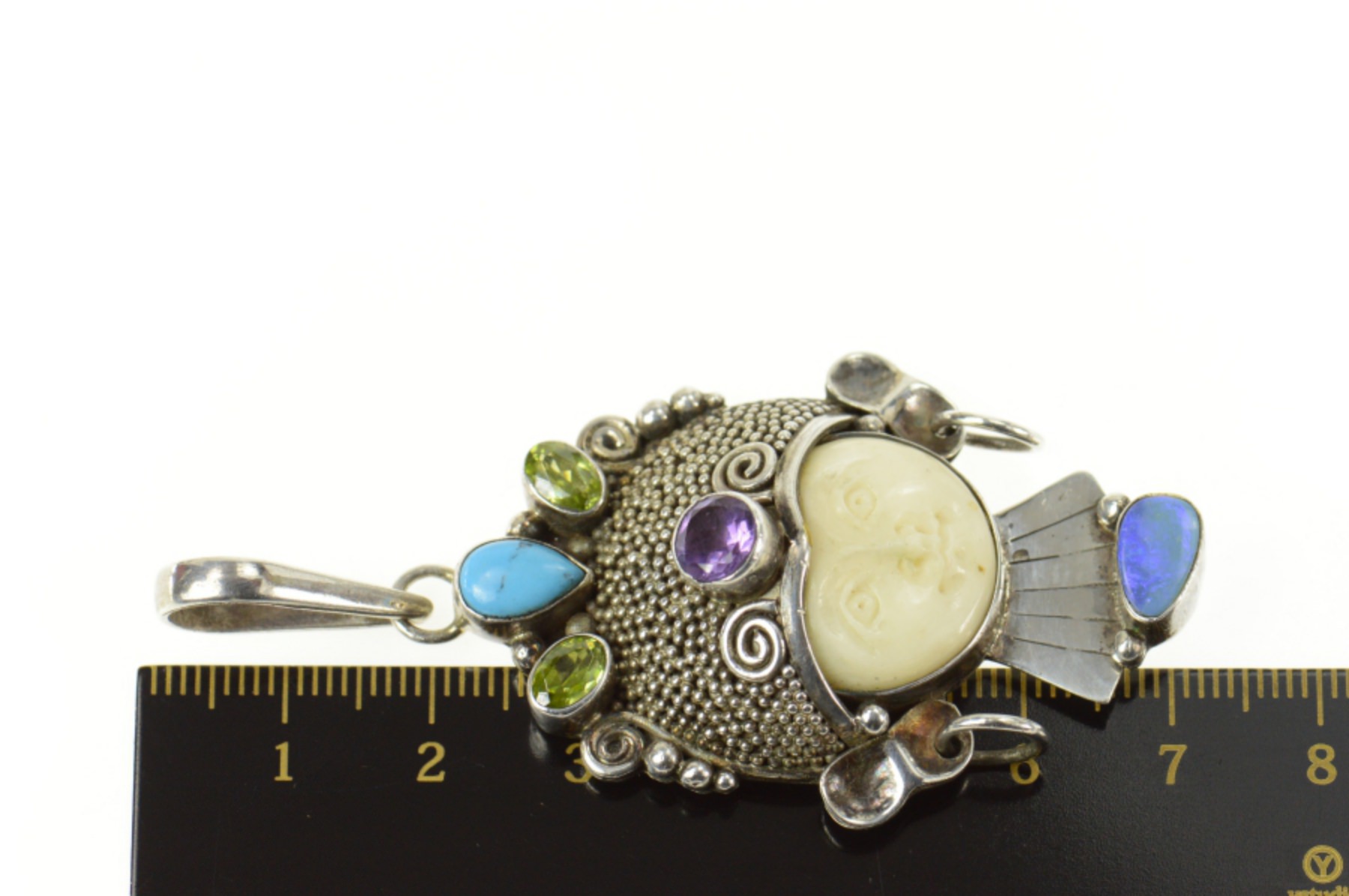 Item:  Sterling Silver Moon Face Black Opal Turquoise Peridot Ornate Pendant