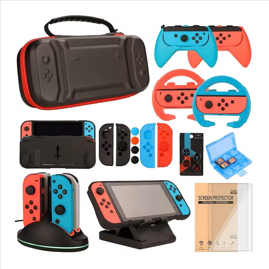 Switch Accessories Bundle for Nintendo Switch Games, Kit with Carrying Case, Steering Wheels, Screen Protectors, Charging Dock, Grips, Caps (23in 1)