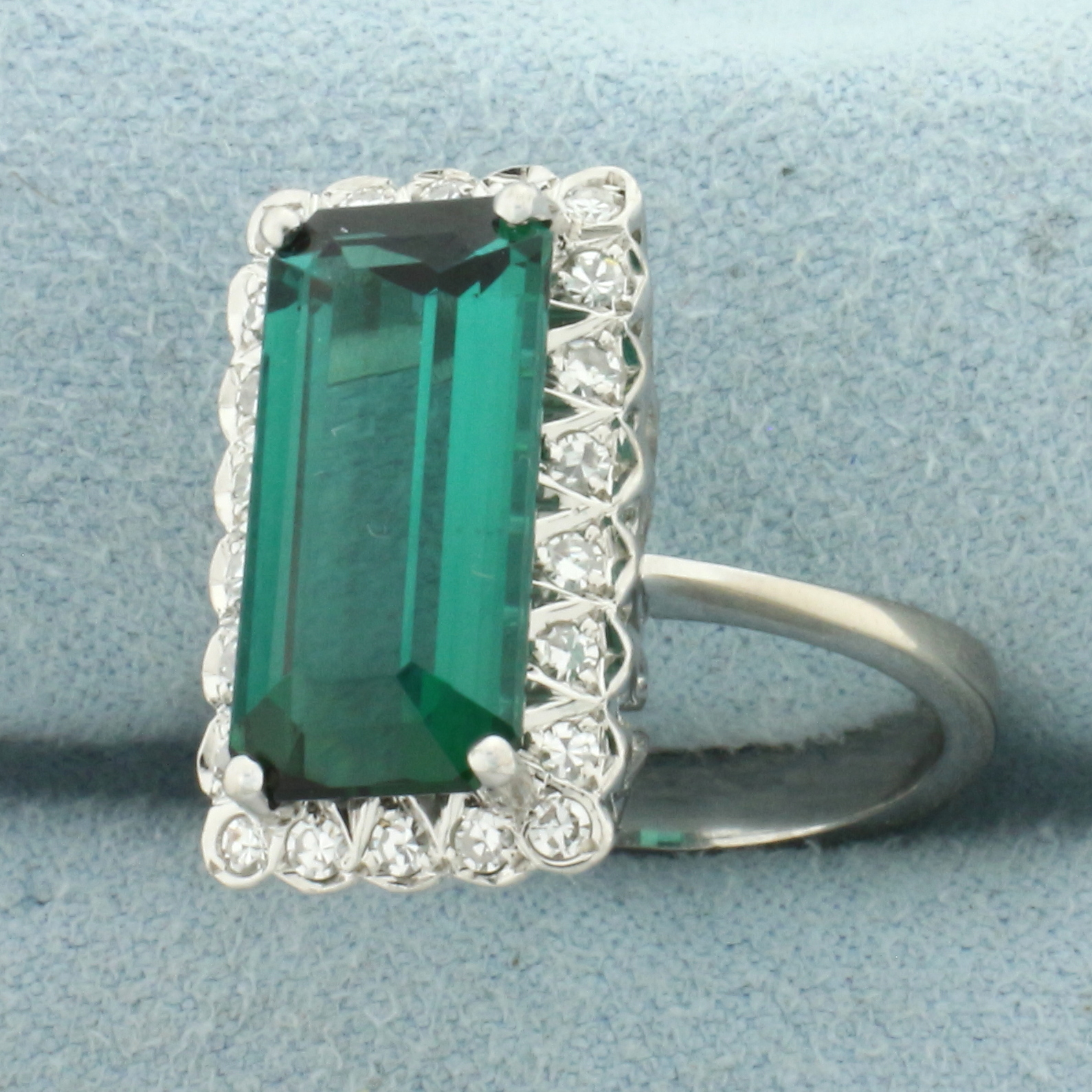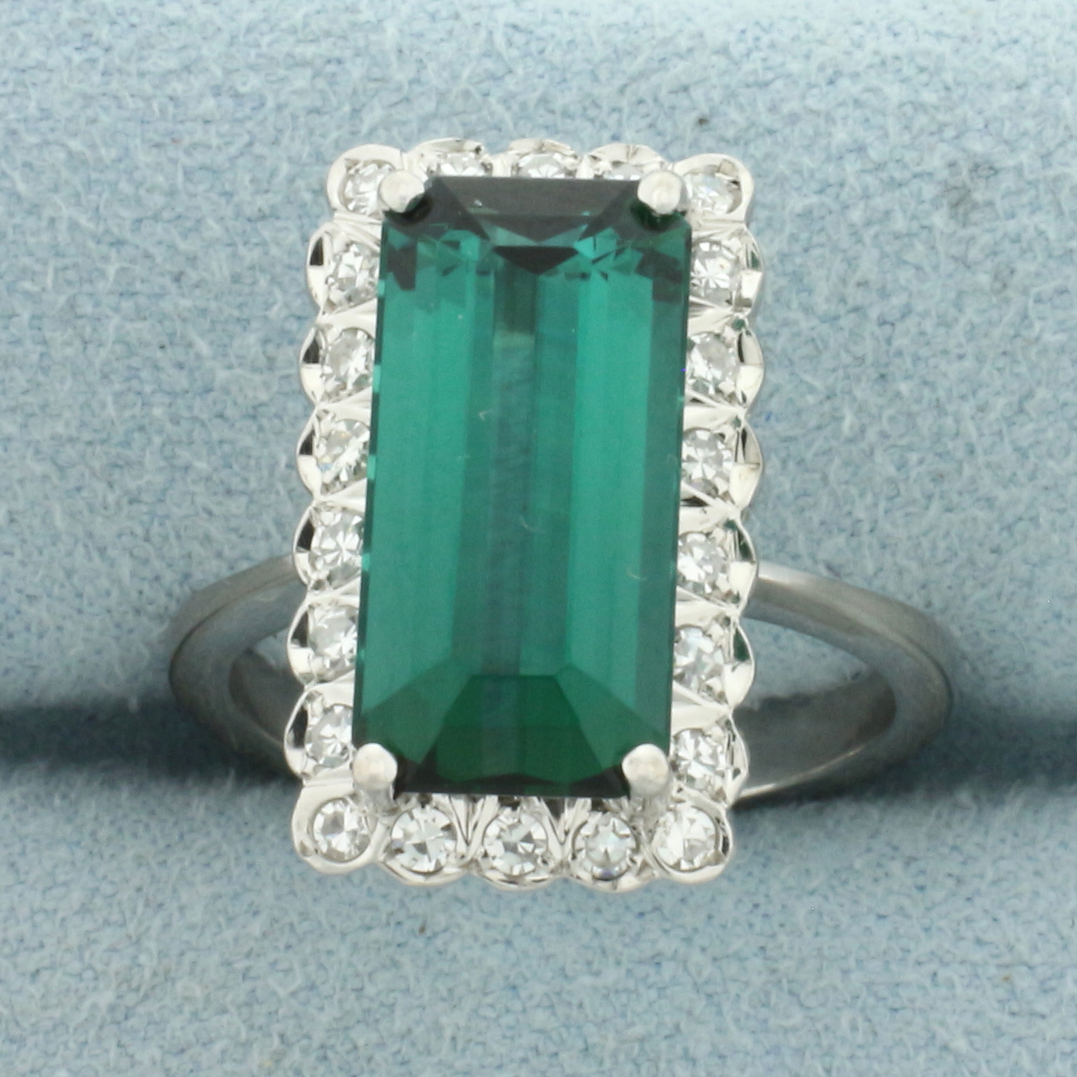 In 18k White Gold. Contains one 15.2x7.4mm high quality elongated emerald cut Green Tourmaline gemstone, approximately 5cts, with intense color and excellent clarity. Also contains twenty-two high quality diamonds, 1/4ct TW, VS clarity/G color. Size 6.5.