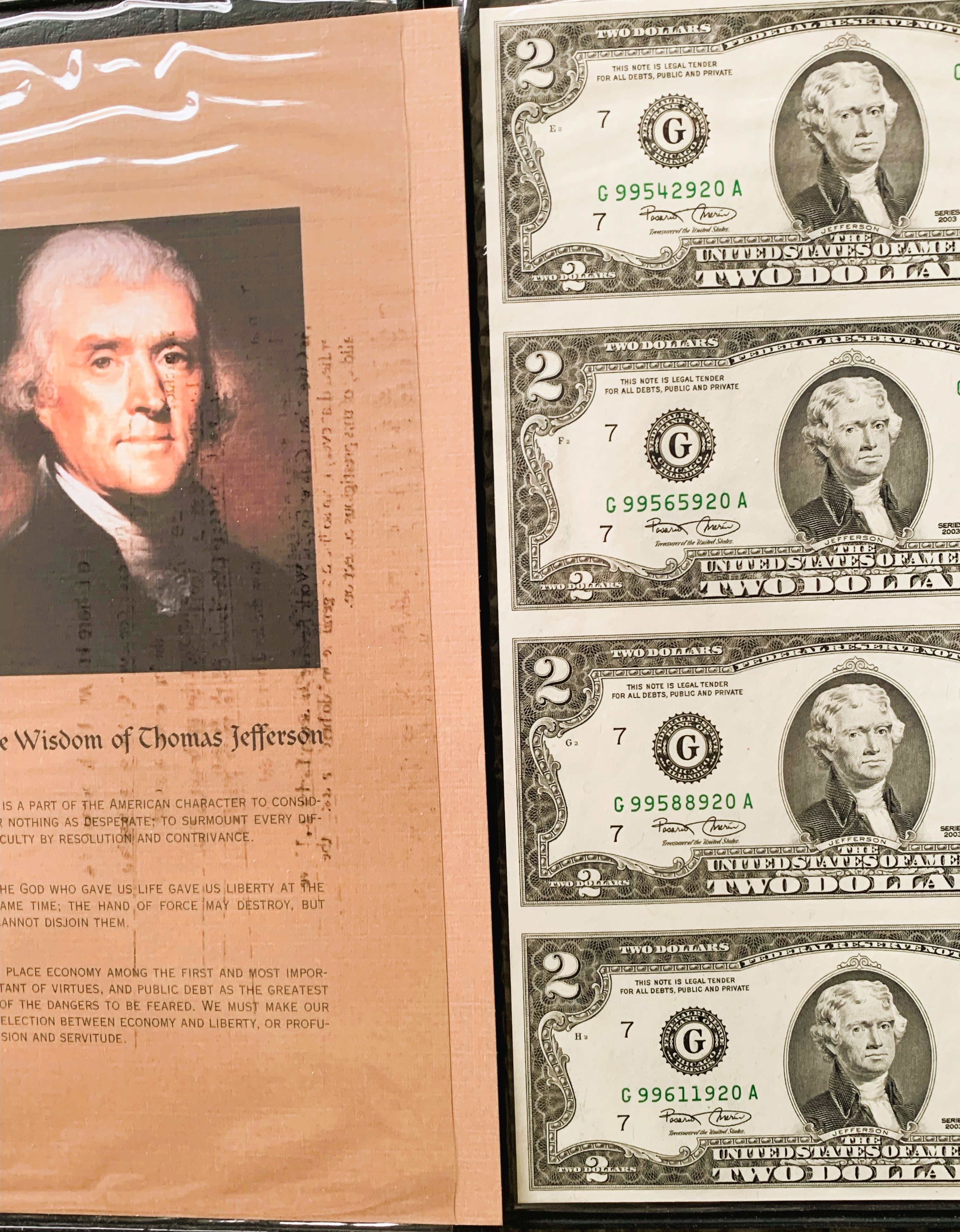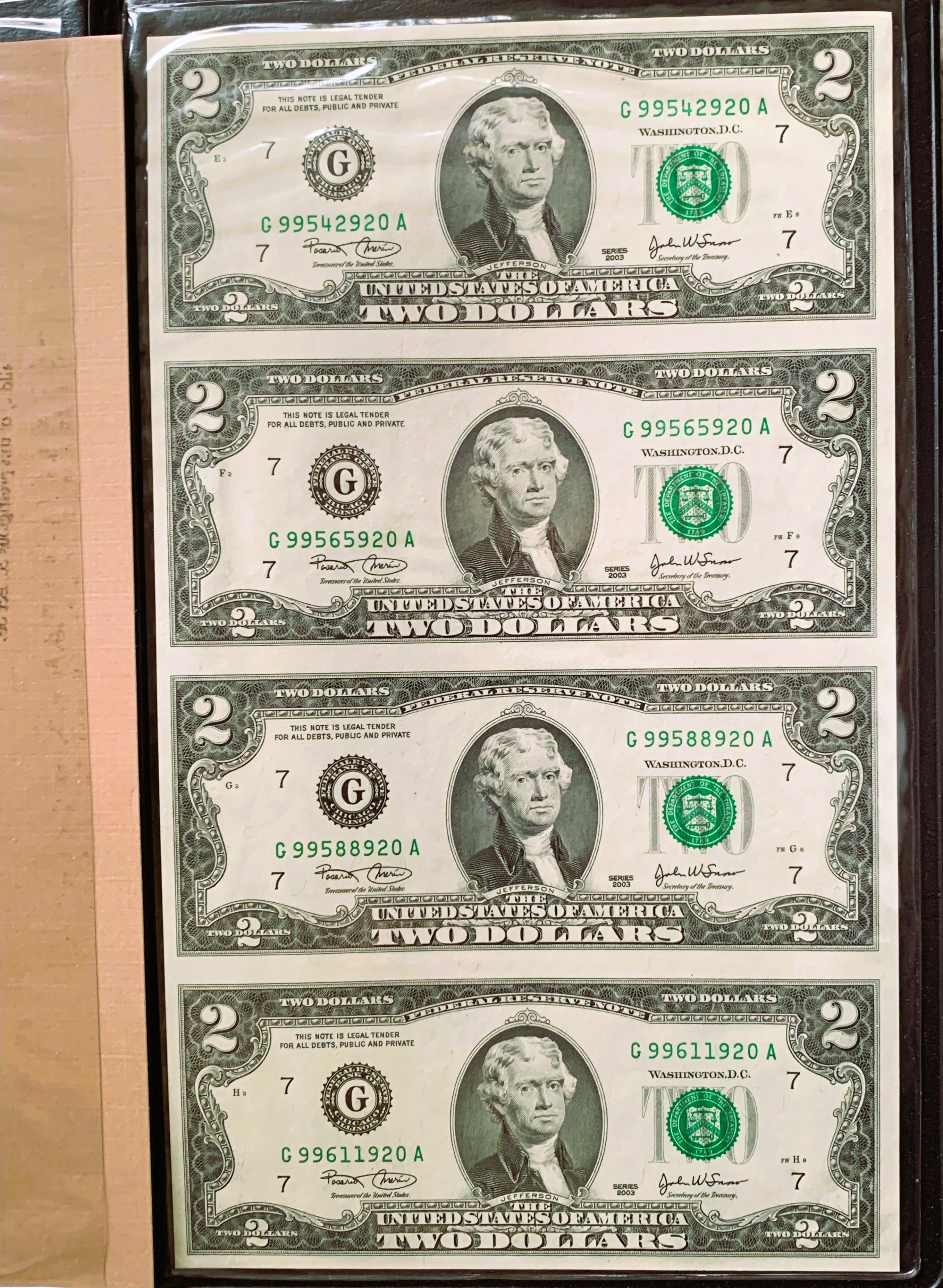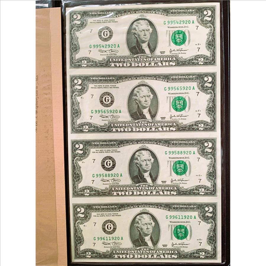 UNCUT SHEET BUREAU OF ENGRAVING & P, UNC CRISP NEW $2 DOLLAR BILLS, WITH 1ST 3 & LAST 3 SERIAL # THE SAME, IN NICE WORLD RESERVE BOOKLET