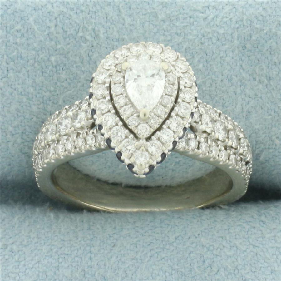 In 14k white gold. Contains one high quality 1/4ct pear shaped diamond, SI clarity/I color. Also contains 3/4ct of high quality diamonds of similar high quality in halo and shank and 1/10ct TW of high quality natural sapphires. Item number Item number 20332385 on Zales website, retails for $3,399. Size: 5. 5.7g.