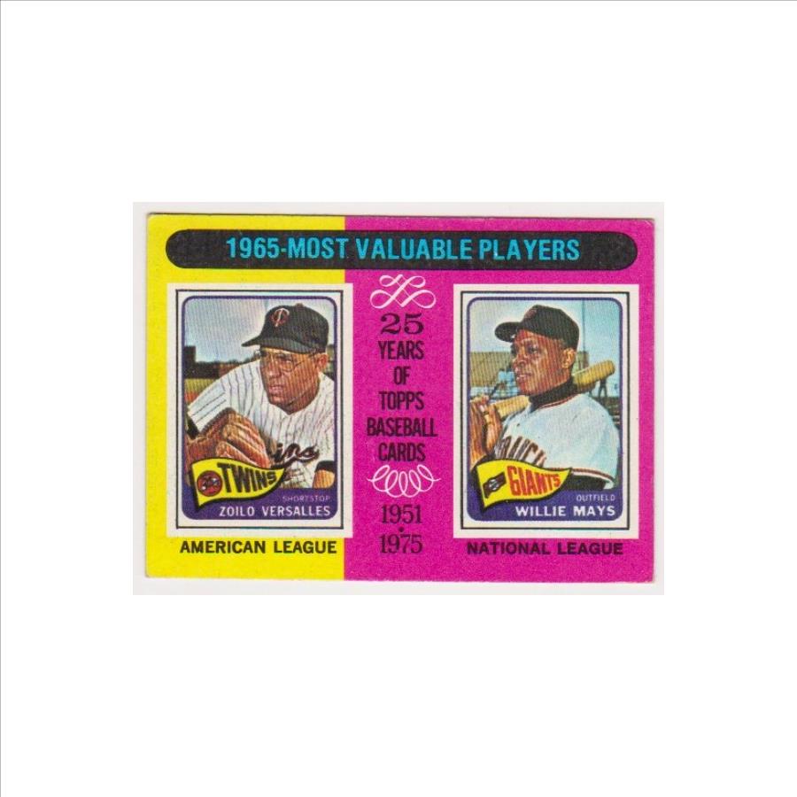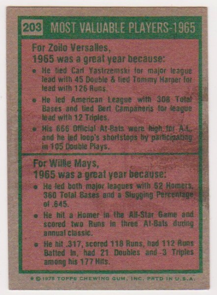 This is an authentic 1975 Topps Willie Mays/Zoilo Versalles #203 card.  This one commemorated Mays and Versalles winning the baseball MVP awards in 1965 and features a photo of each of their 1965 Topps cards on the front.  This is an approximately VG-EX condition card.  It has wear including a wax pack stain on the back and is slightly miscut, but overall displays pretty well in a holder.  It is an original 51 year old card featuring both of these 1960's stars.