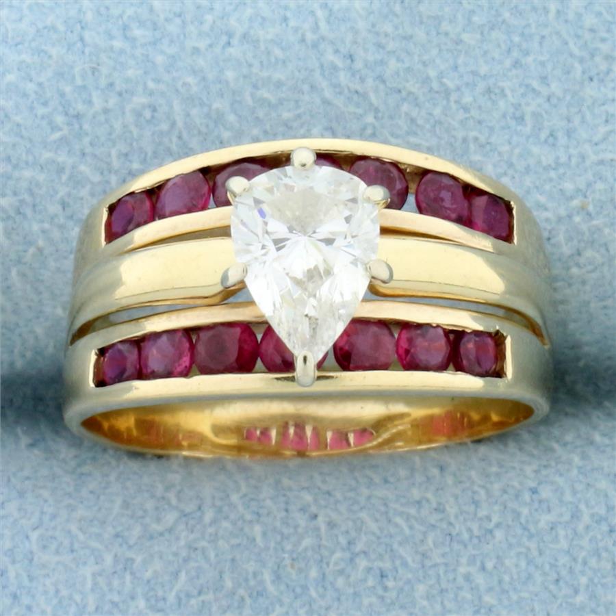 In 14K Yellow Gold. Contains one high quality natural 1ct pear shaped Diamond, VS clarity/H color. Also contains fourteen high quality natural 2mm round cut Ruby gemstones with bright color and excellent clarity. Size 9. 6.3g