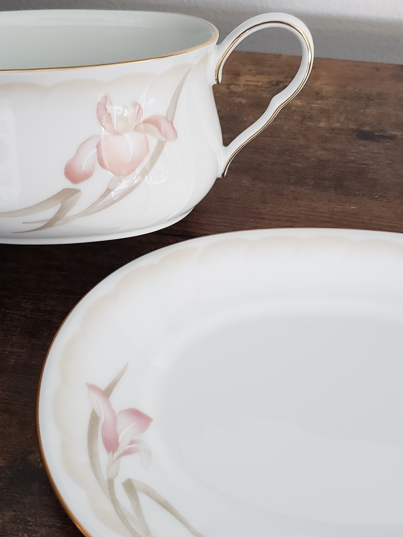 Decorated with beautiful pink iris floral pattern with gold trim on rims and handle