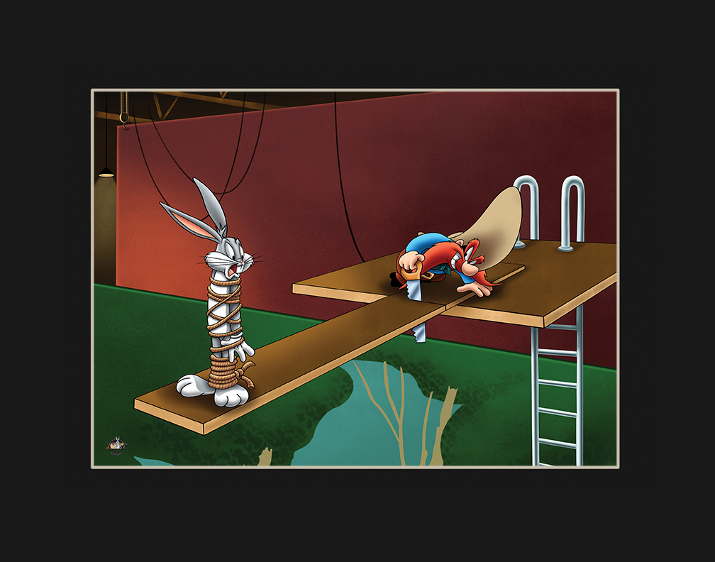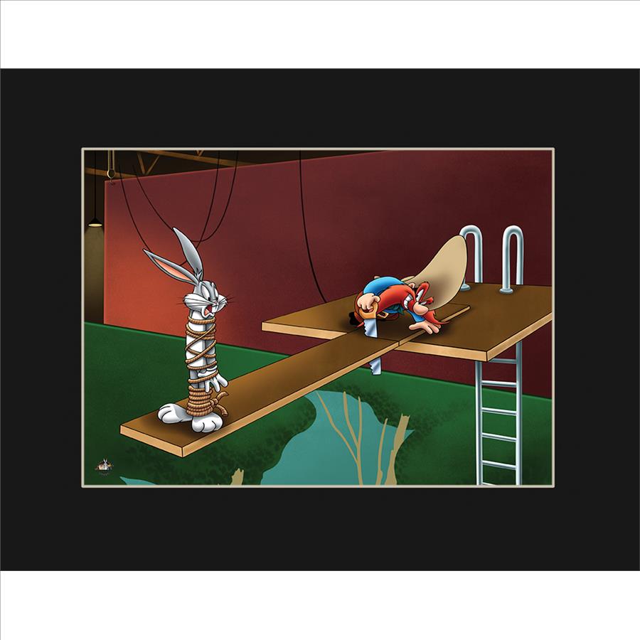 This limited-edition lithograph is entitled “High Diving Hare”. High Diving Hare is a 1948-produced Warner Brothers Looney Tunes theatrical cartoon short starring Bugs Bunny and Yosemite Sam. Released to theaters on April 30, 1949, the short is an expansion of a gag from Stage Door Cartoon, which was also directed by Friz Freleng.  High Diving Hare can be seen in the third act of The Looney Looney Looney Bugs Bunny Movie.  Presented matted with COA -11x14