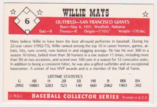 Willie Mays 1984 R.G.I. #6 Card - HOF'er