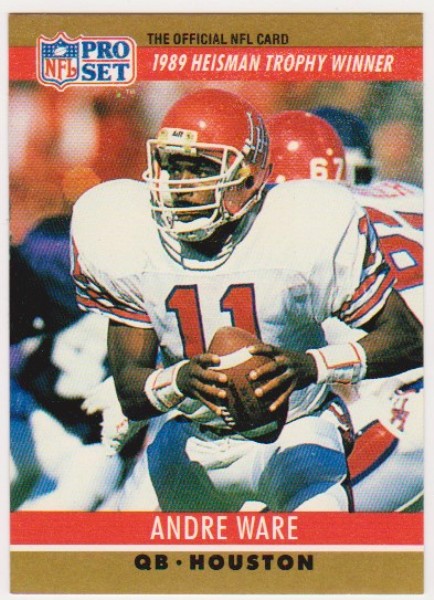 This is a 1990 Pro Set Bo Jackson Wrong Front Error Card. This one has Andre Ware on the front but has the Bo Jackson #155 back.  It is in approximately EX condition.  It has some corner/surface wear, but overall displays pretty well.