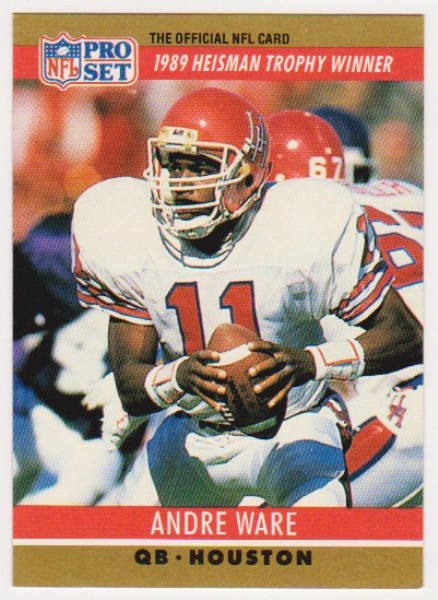 This is a 1990 Pro Set Bo Jackson Wrong Front Error Card. This one has Andre Ware on the front but has the Bo Jackson #155 back.  It is in approximately EX condition.  It has some corner/surface wear, but overall displays pretty well.