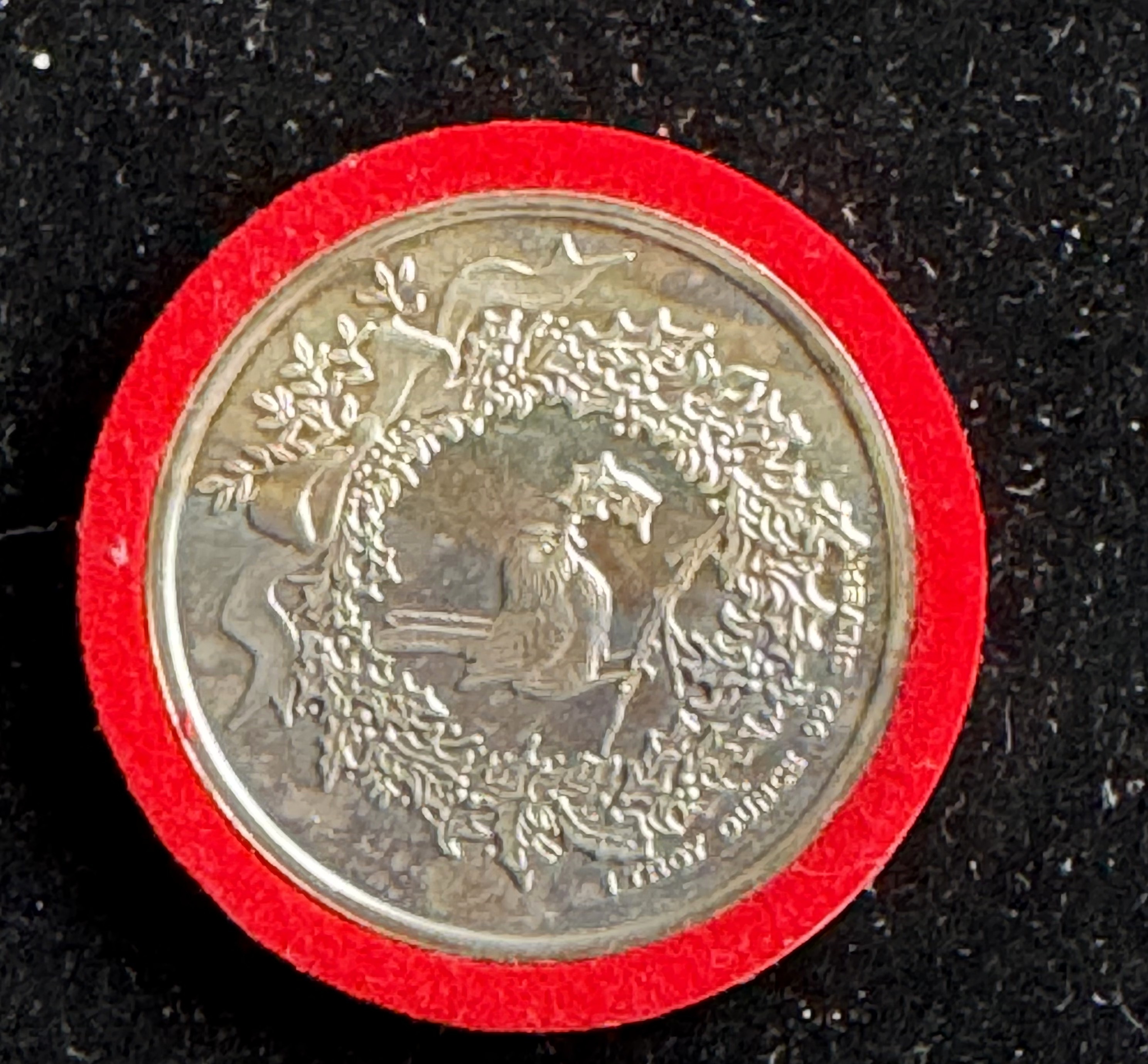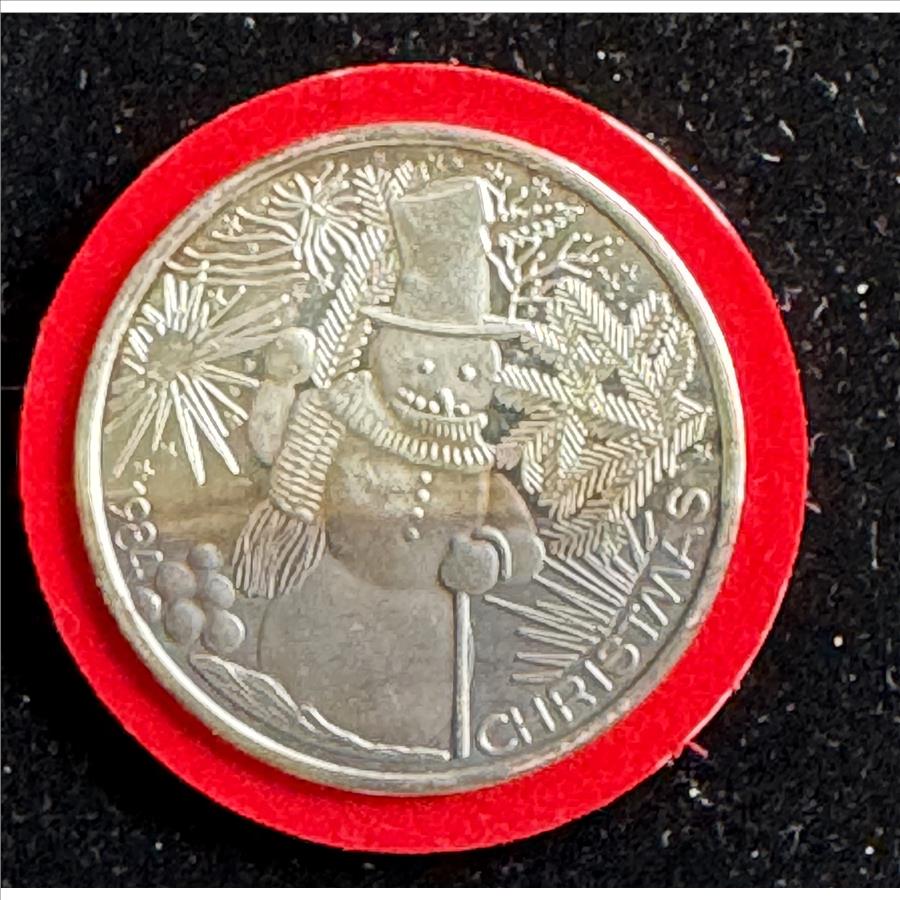 XMAS, 1oz .999 FINE SILVER, PROOF COIN, FROSTY THE SNOWMAN IN AN ORNAMENT HANGING CAPSULE, NICE TONING