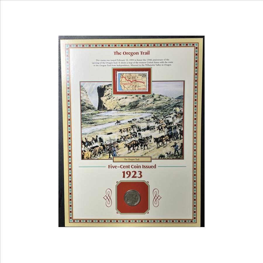 * 1923 U.S. Buffalo Nickel & 1993 29¢ Stamp - The Oregon Trail - Coin & Stamp on Collector's Panel