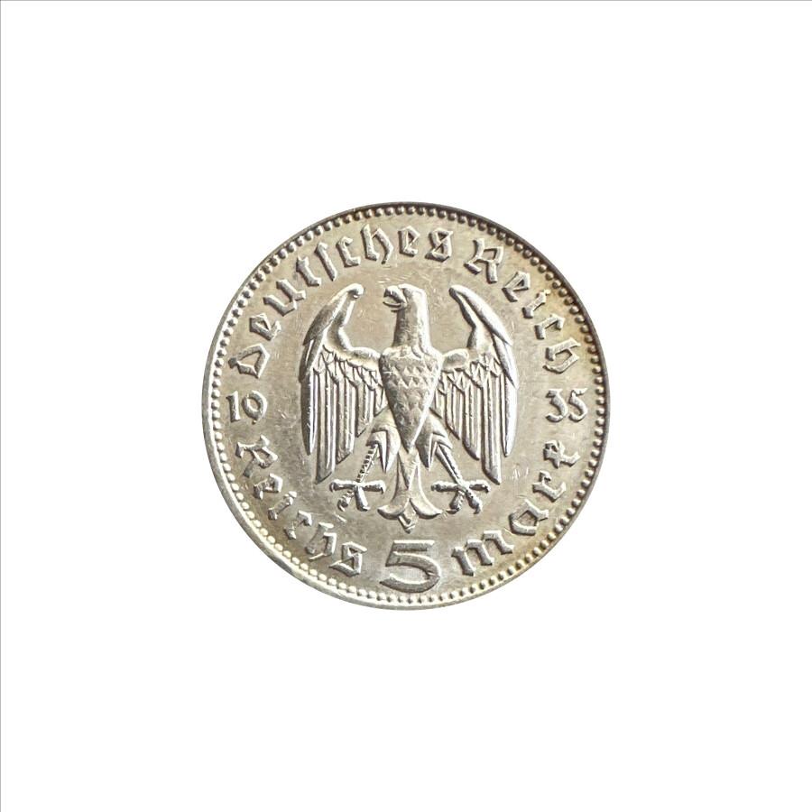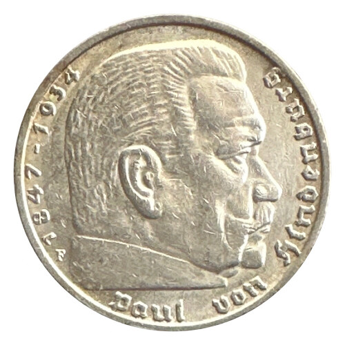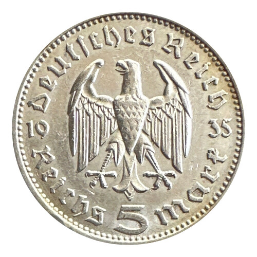 - 1935 F Germany Silver 5 Reichsmark (Paul von Hindenburg) - Great Detail
