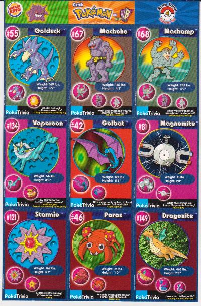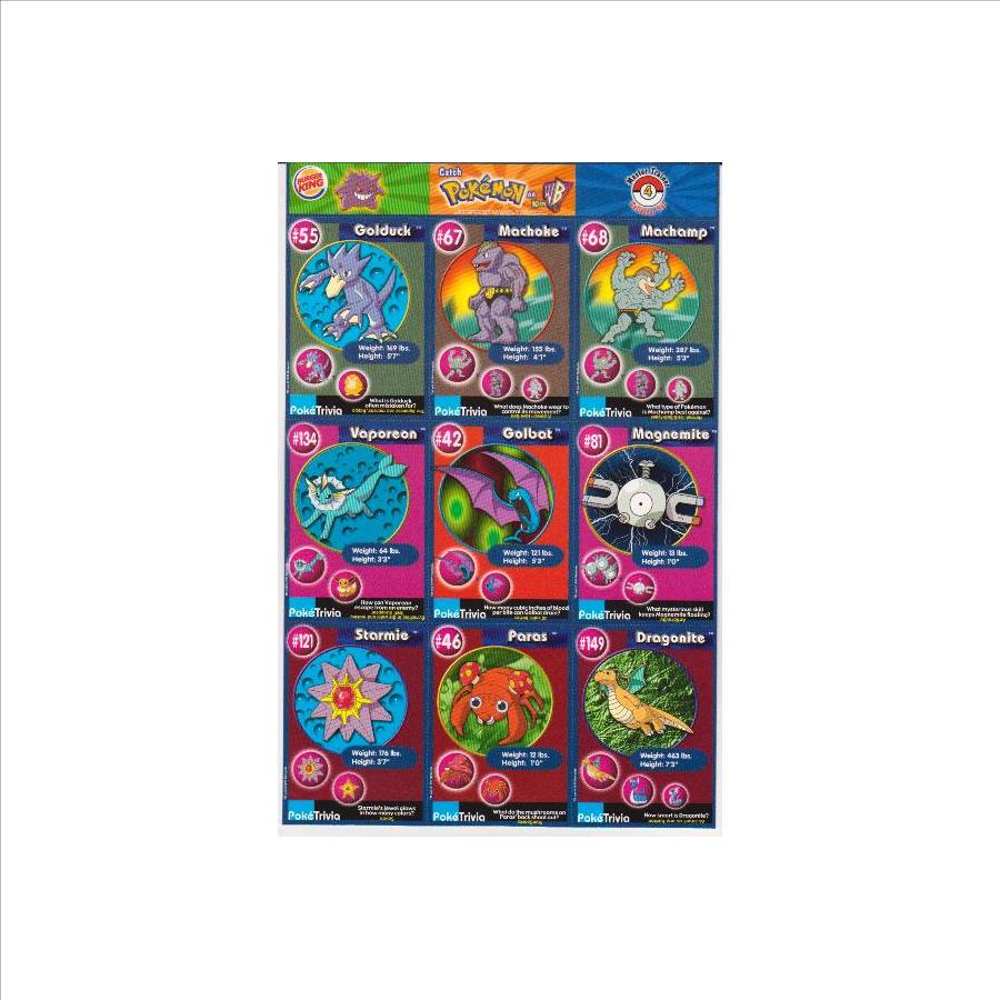 This is an original 1999 Burger King Pokemon Master Trainer Collector Set Uncut Sheet.  This is sheet #4 from the set that has Golduck #55, Machoke #67, Machamp #68, Vaporeon #134, Golbat #42, Magnemite #81, Starmie #121, Paras #46 and Dragonite #149.  The sheet has light corner/edge wear, but is in approximately Excellent overall condition.  This is an original vintage sheet of 1999 Pokemon cards.