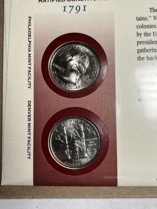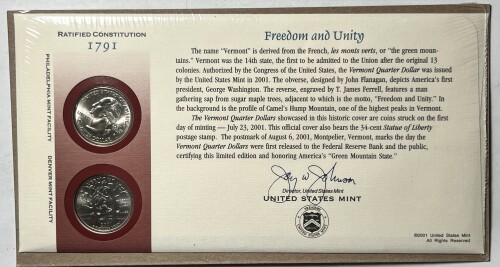 * 2001 (P&D) Vermont Quarter Dollar 1st Day Cover-2 Quarters & 34 c. Statue of Liberty Stamp-Freedom & Unity (and Maple Syrup)