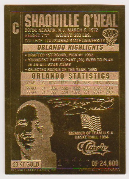 23 kt Gold - Shaquille O'Neal 1994 Classic Gold Card (1/24,900)