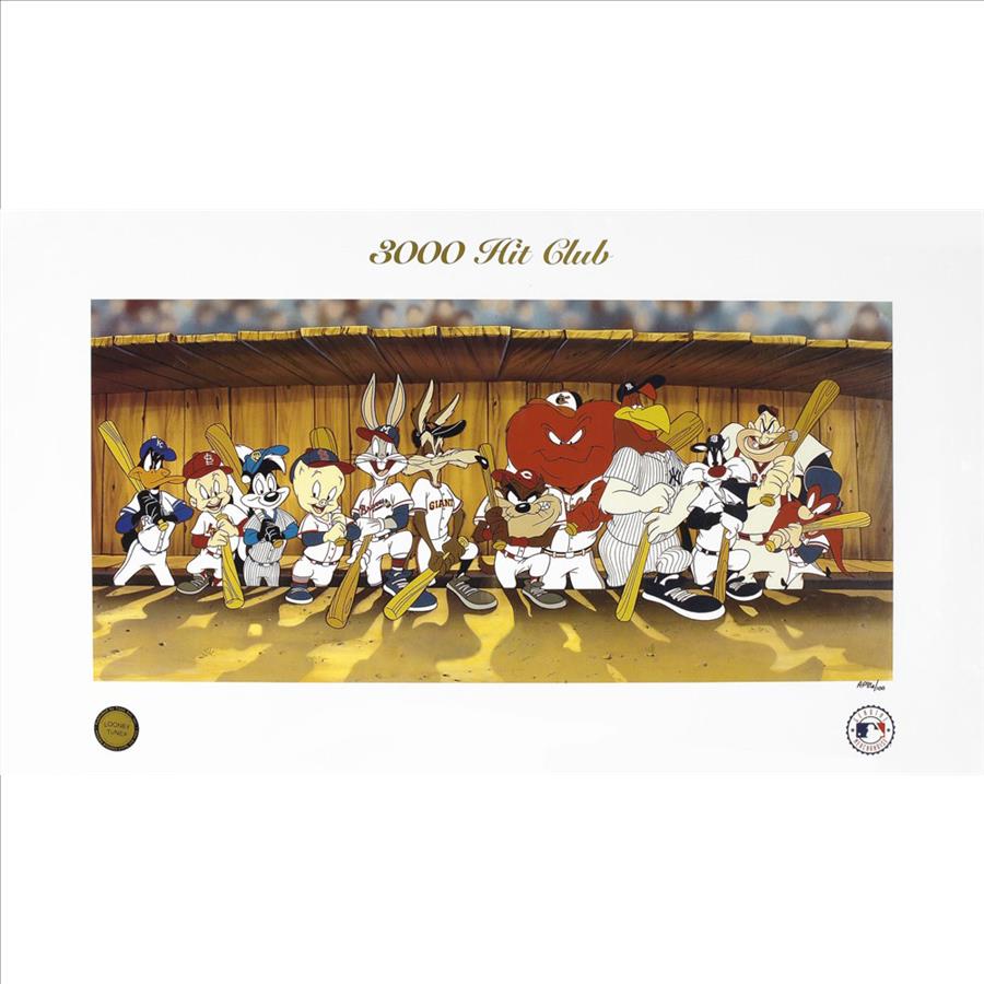 A limited-edition lithograph entitled "3000 Hit Club." It depicts a line of Looney Tunes characters wearing baseball uniforms and sitting in a dug out holding bats. The piece pays tribute to members of this club, including Pete Rose, George Brett, Lou Brock, Robin Young, Stan Musial, Hank Aaron, Willie Mays, Eddie Murray, Dave Winfield, Al Kaline, Carl Yastrzemski, and Rod Carew. Includes a Classic Moments certificate of authenticity.  18 1/2 x 32 1/2 1   Licensed by MLB and Warner Bros.