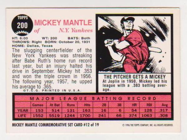 Mickey Mantle 1962 Topps #200 Commemorative Card - 1996 Topps #12 of 19 Insert Card