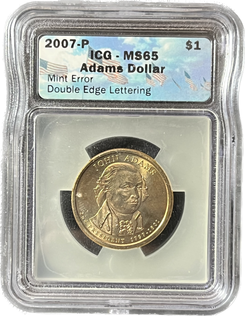 * Mint Error -Double Edge Lettering: 2007-P U.S. Presidential One Dollar - John Adams - ICG Certified MS65