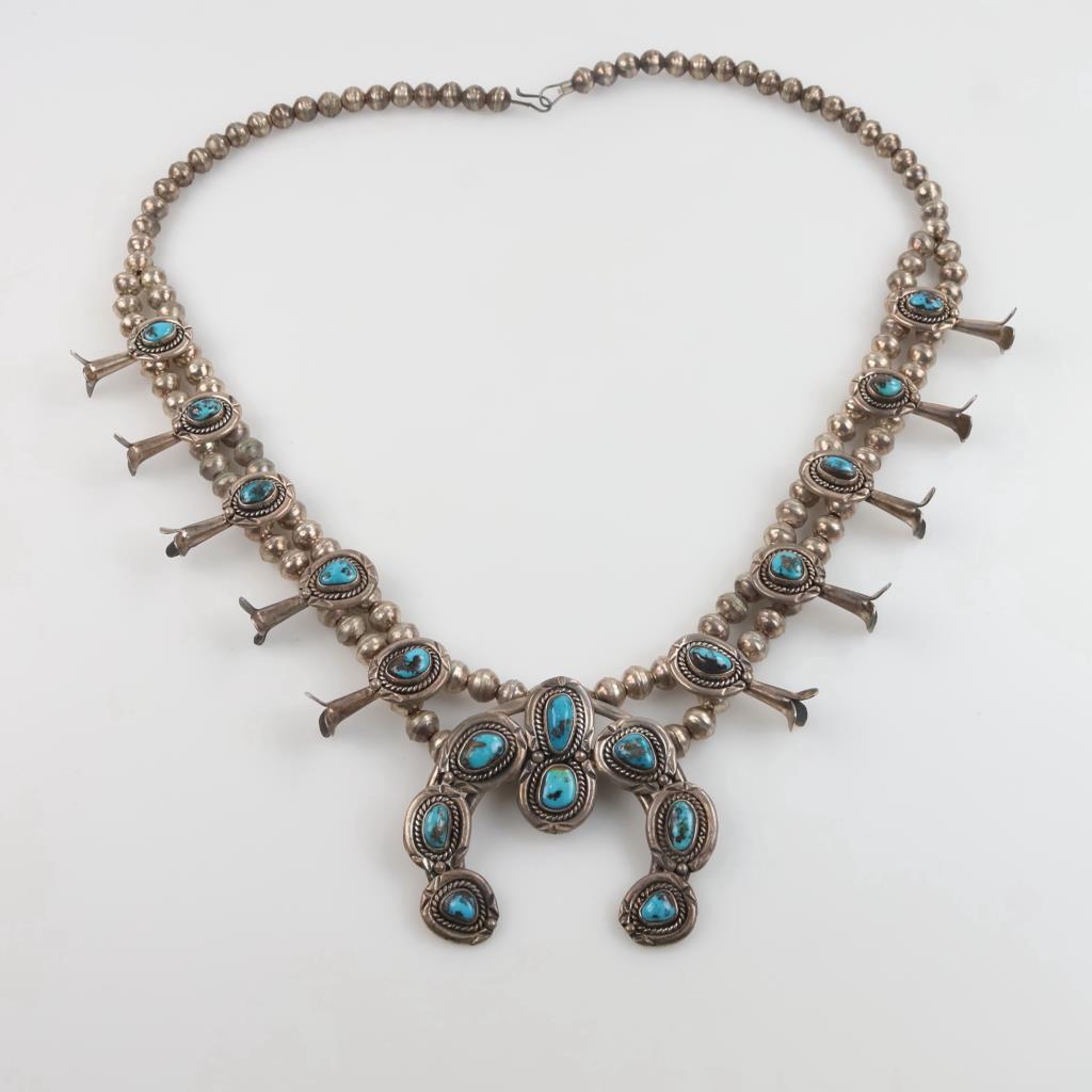 0.800 - 0.900 Silver Squash Blossom Turquoise Necklace