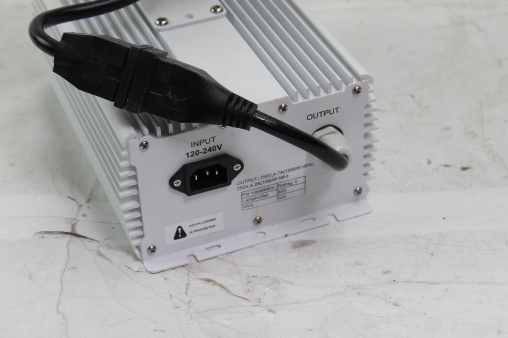 Get a great deal with this online auction for a ballast presented by Property Room on behalf of a law enforcement or public agency client. Model: HPS/MH 1000W-TG 2XXX1W Watts: 1000W Type: Metal Halide/ High Pressure Sodium 120-240V/ 50/60Hz / 9.22A Measurements: aprox. 9.5" x 7" x 4" Cosmetic Condition: 10" x 10.5" x 4" Power Cord Condition: n/a - Testing Results: Item is untested due to lack of proper testing equipment.
