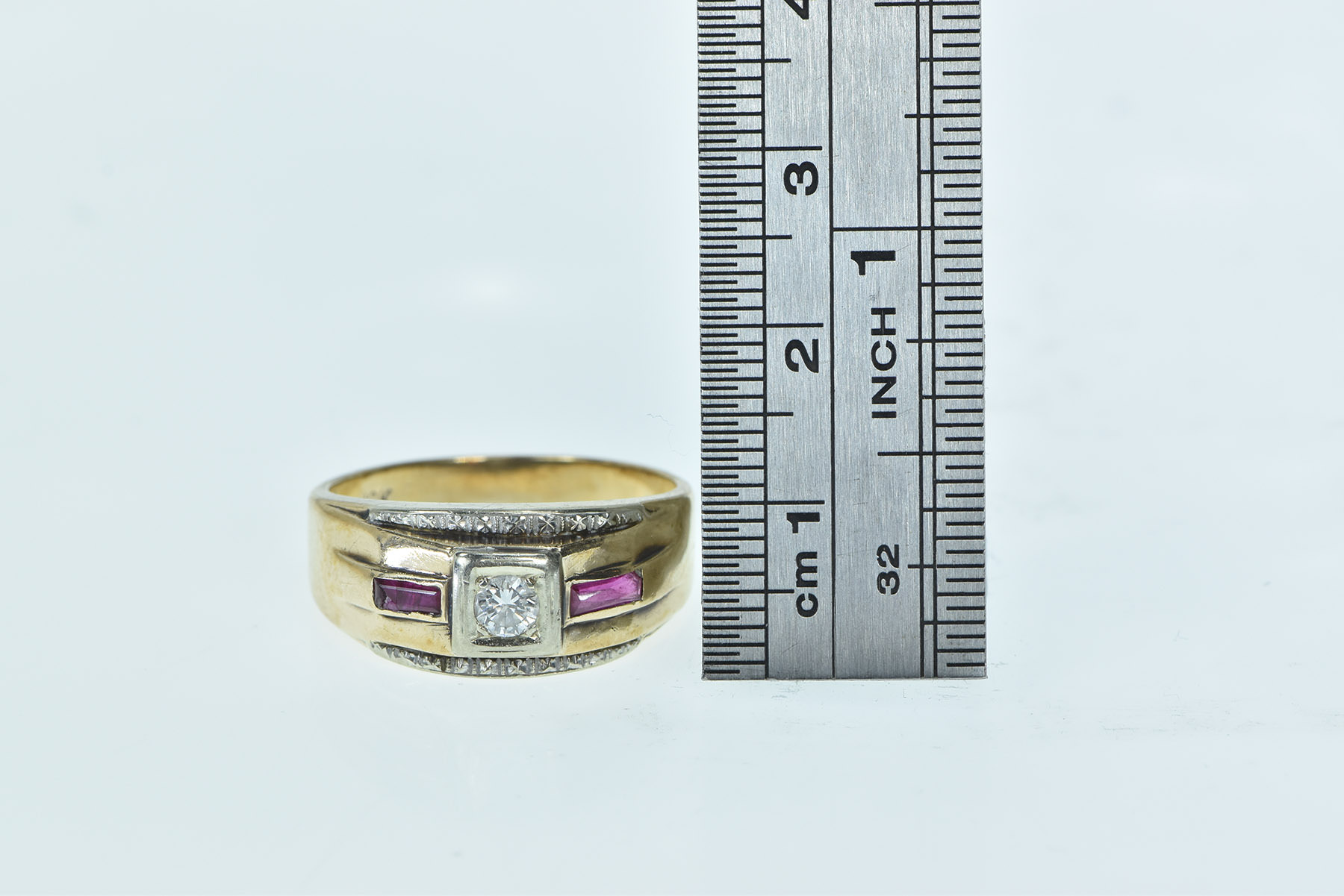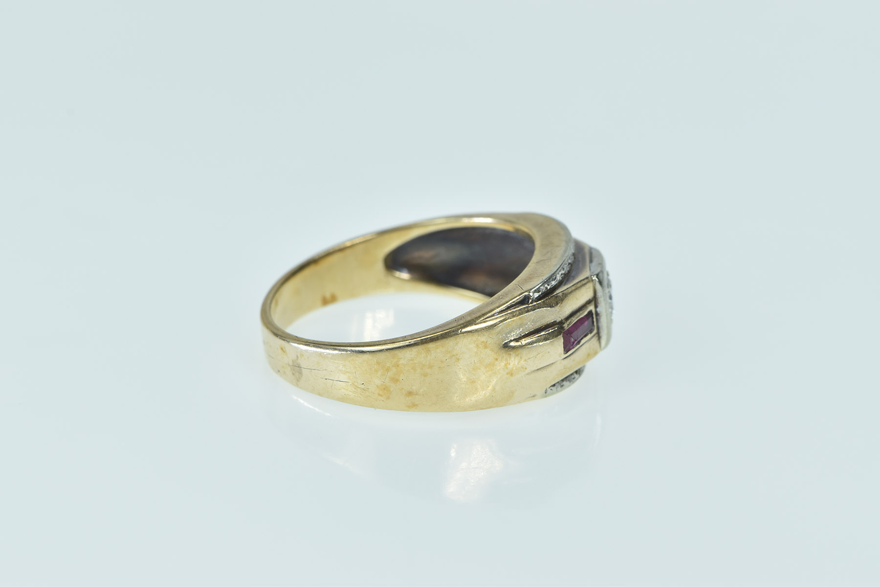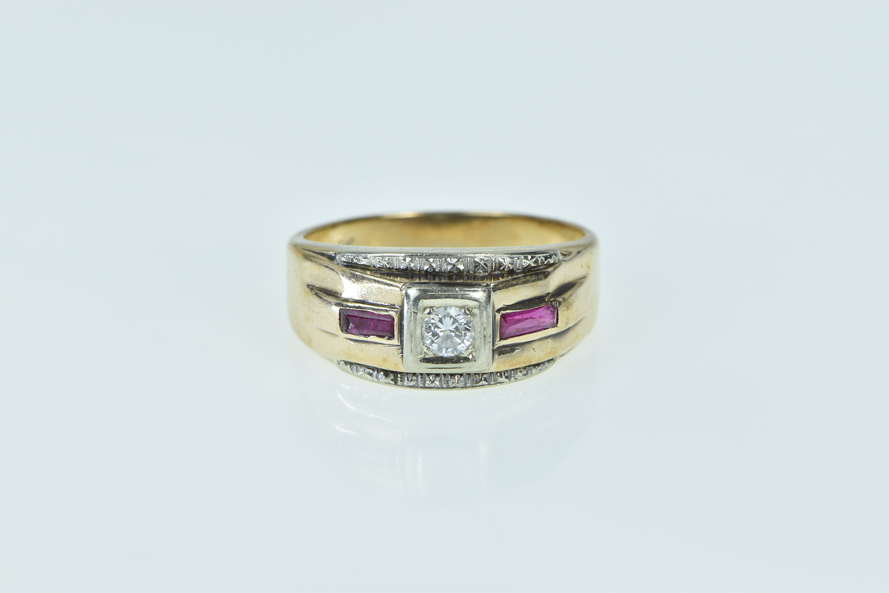 Item:  10K 1940's Diamond Syn. Ruby Wedding Band Yellow Gold Ring, Size 10.25