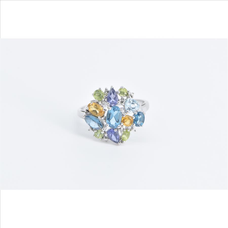 Item:  10K Blue Topaz Citrine Peridot Diamond Cluster White Gold Ring, Size 7.5