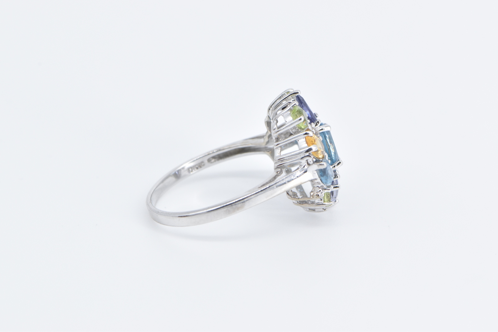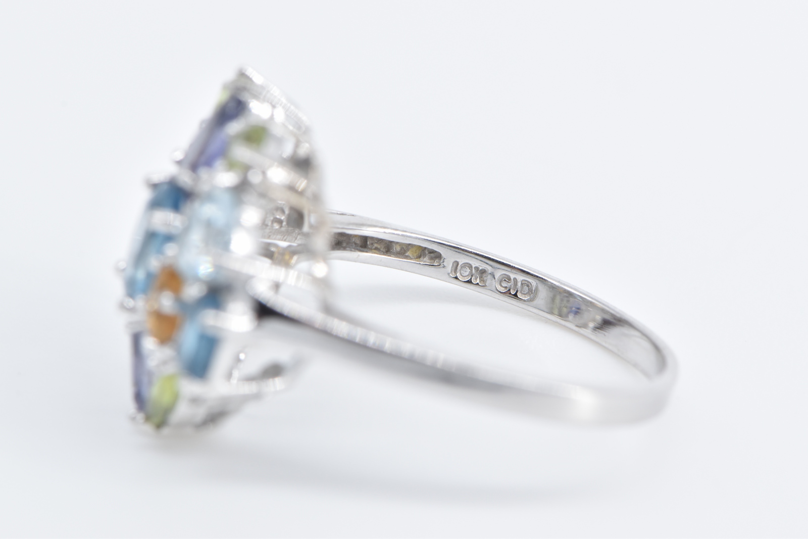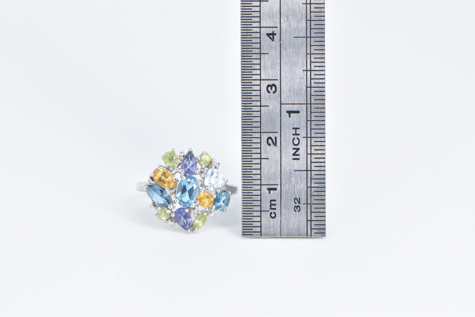 10K Blue Topaz Citrine Peridot Diamond Cluster White Gold Ring, Size 7.5