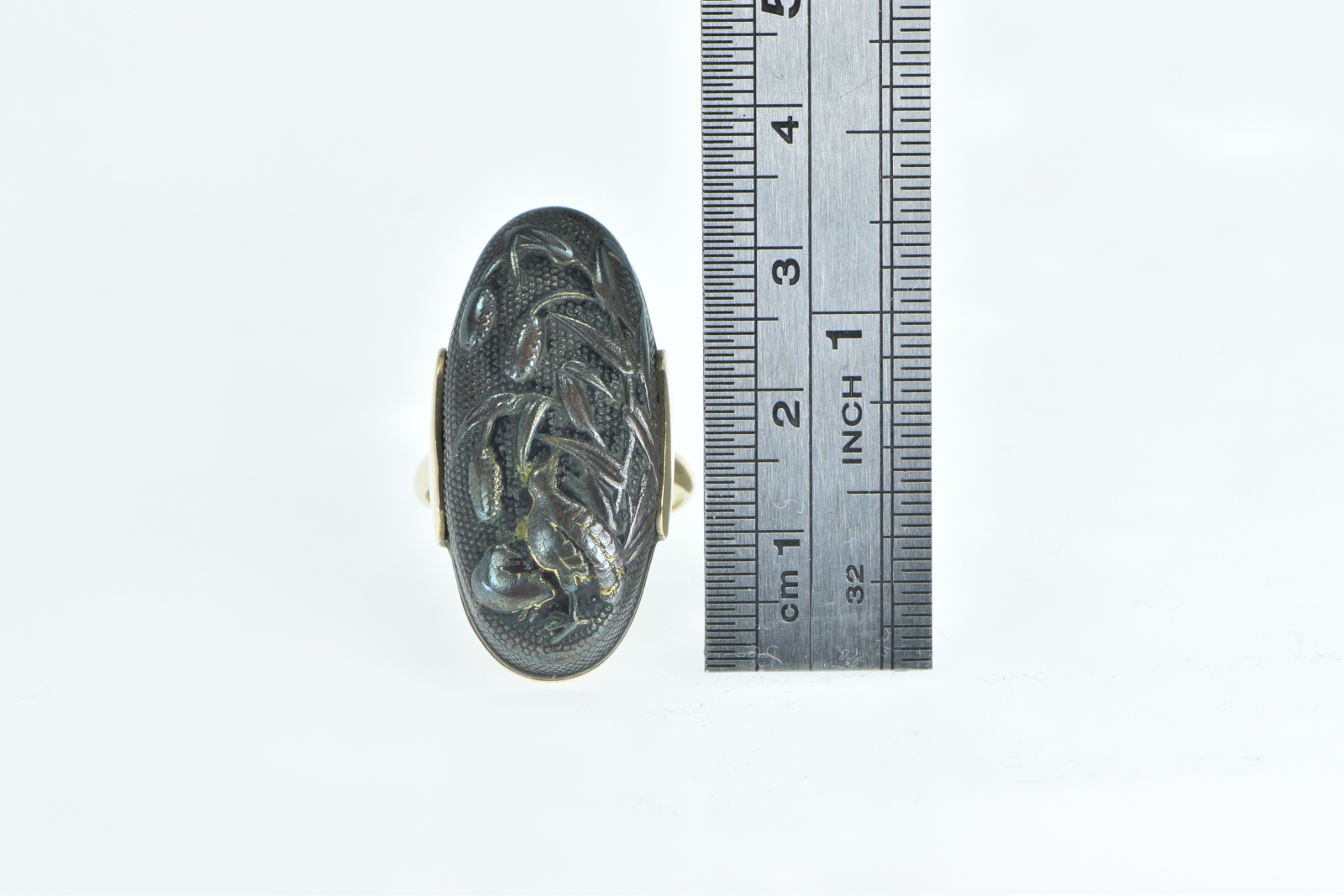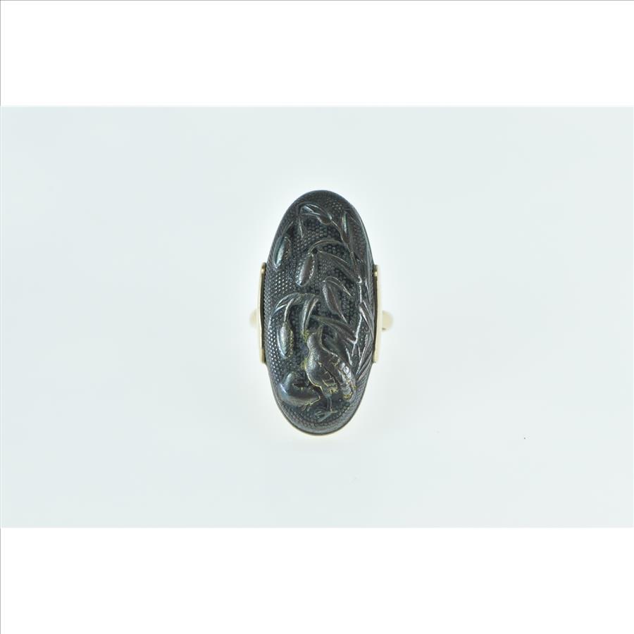 Item:  10K Bronze Quail Cattail Scene Domed Statement Yellow Gold Ring, Size 7.75