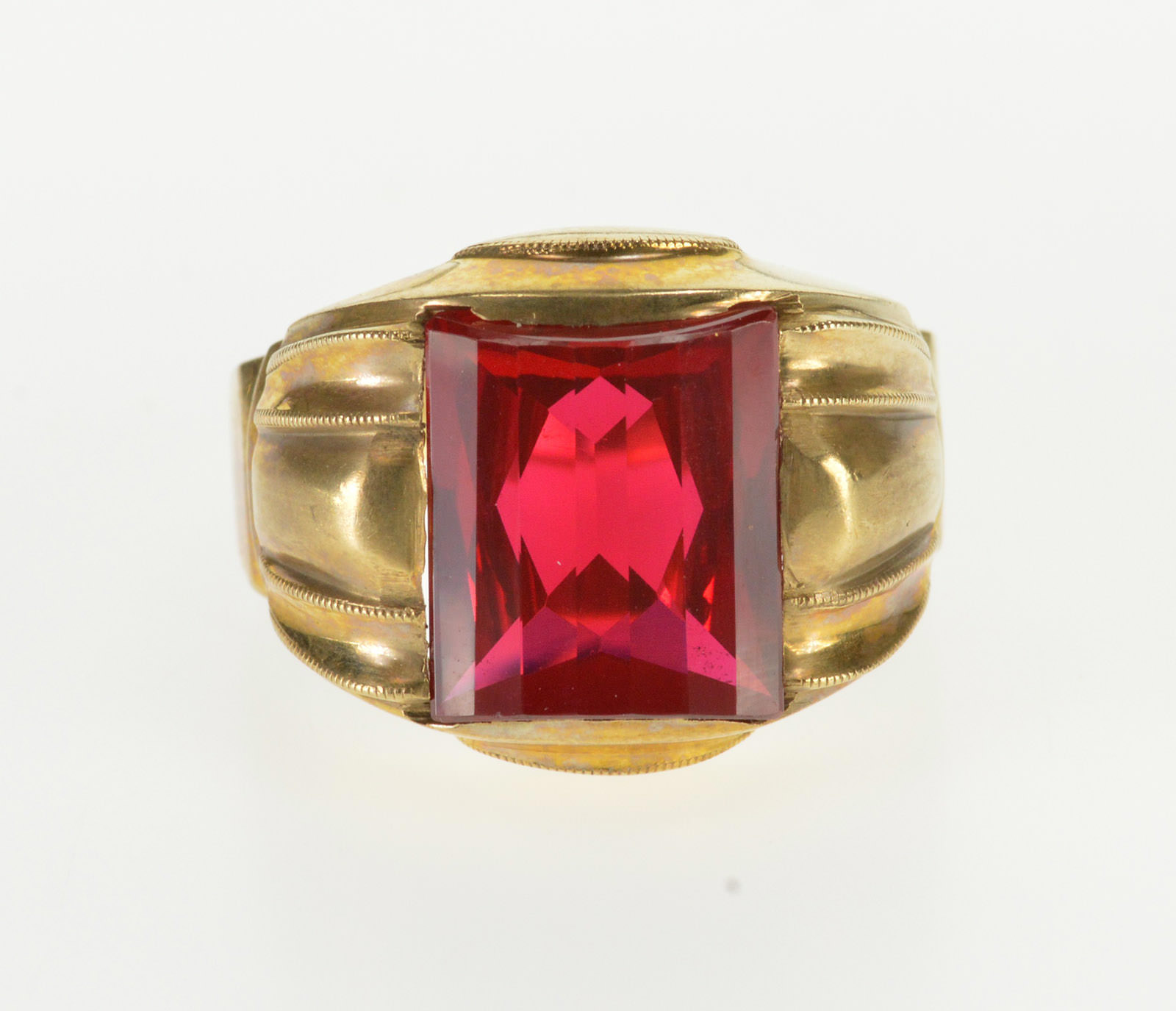 10K Opposed Bar Cut Syn Ruby 1940's Statement Yellow Gold Ring, Size 8.25