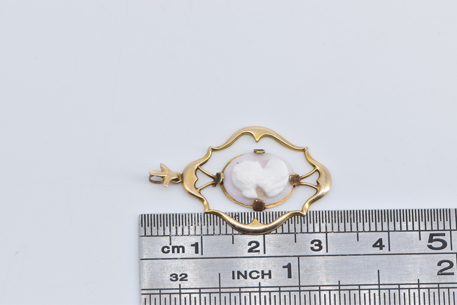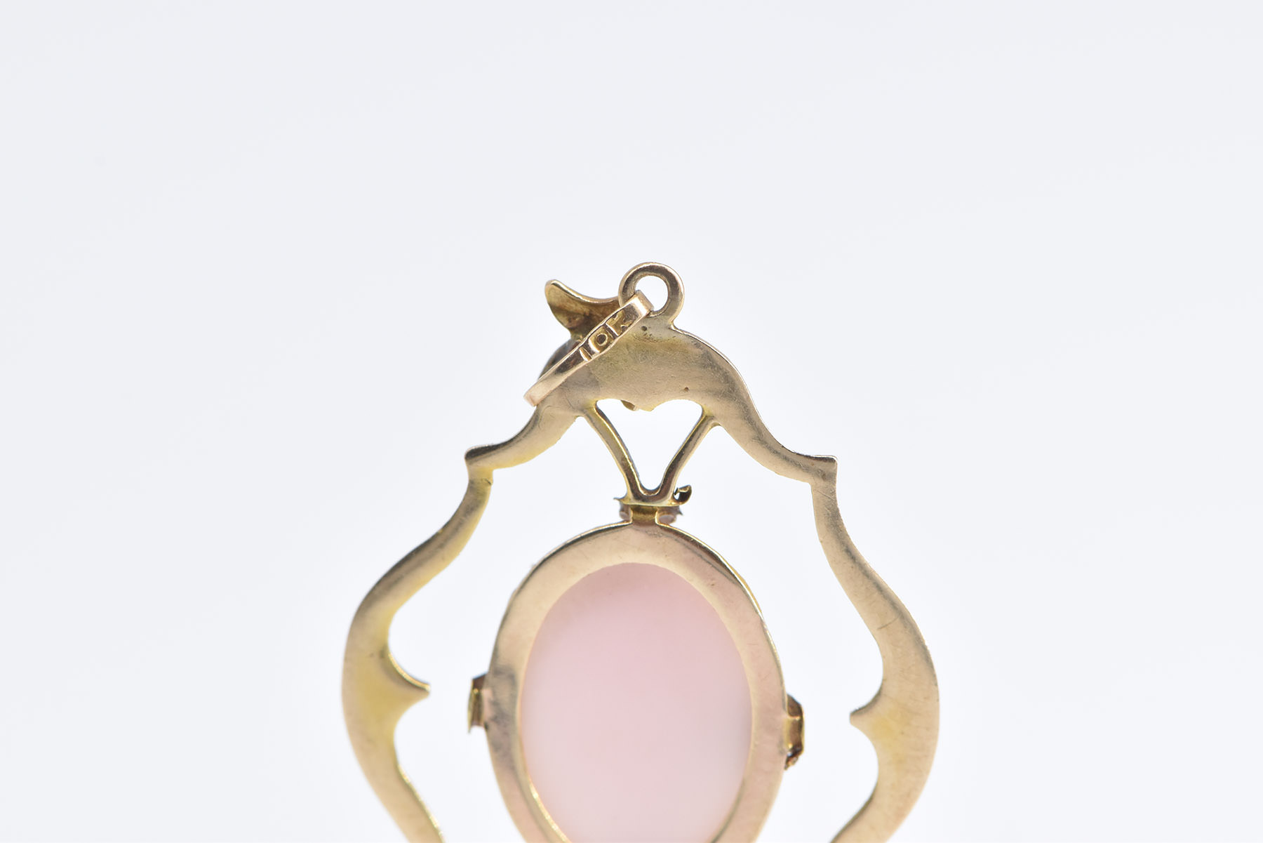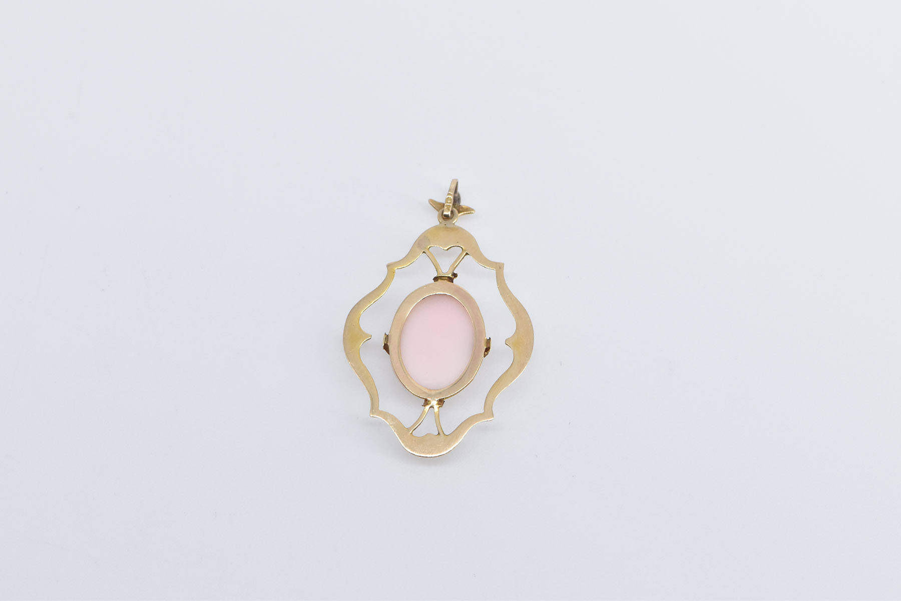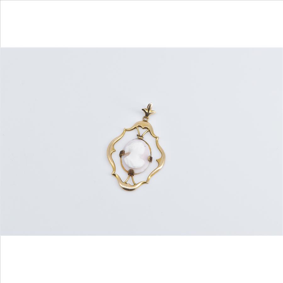 Item:  10K Oval Pink Coral Carved Cameo Lady Ornate Yellow Gold Pendant